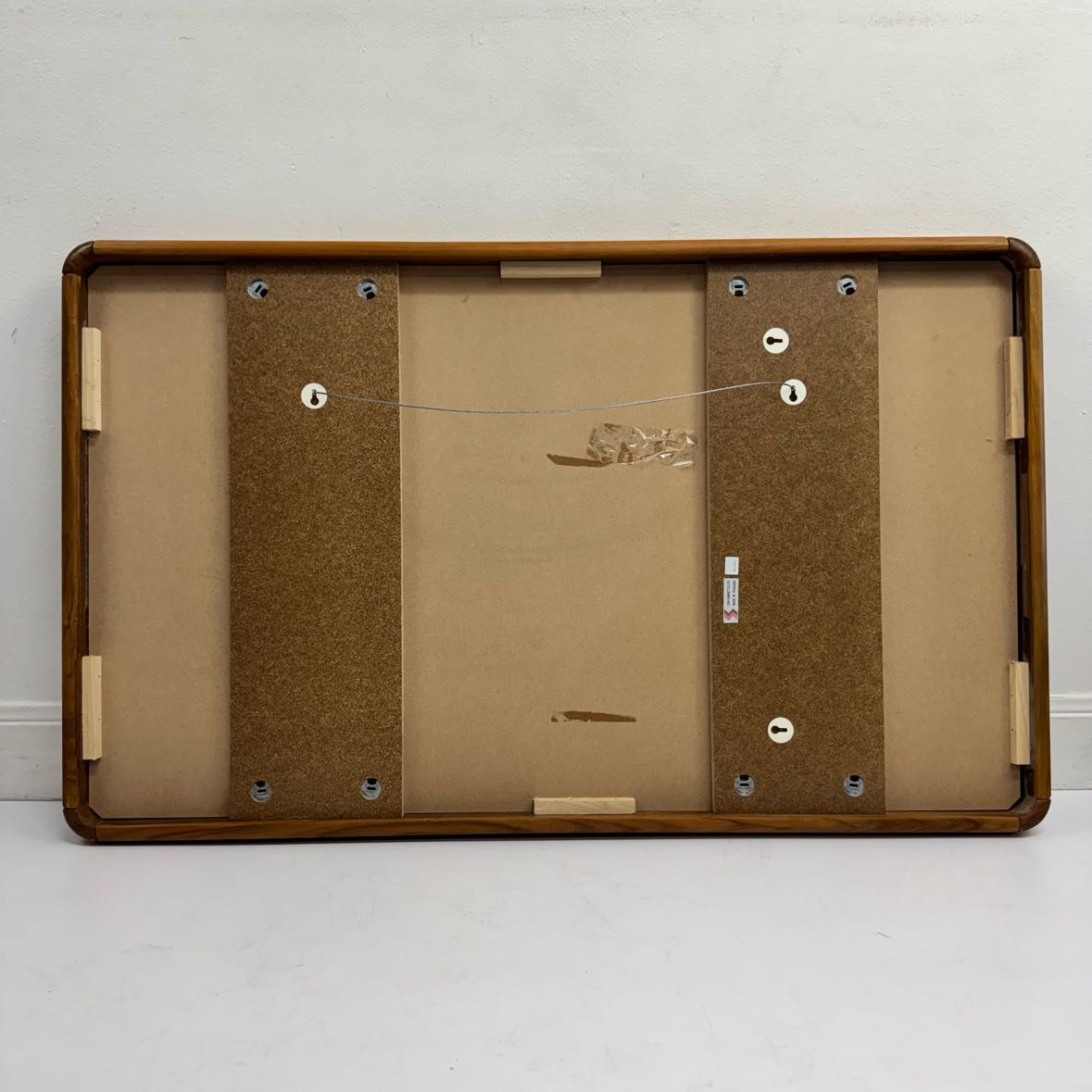 Large framed mirror c. 1980s made of teak wood with a creative and well designed hanging system on the back that allows it to hang vertically or horizontally. The corners are rounded and it is in excellent vintage condition.| The sale of this item benefits Midland Animal Shelter Adoptables.