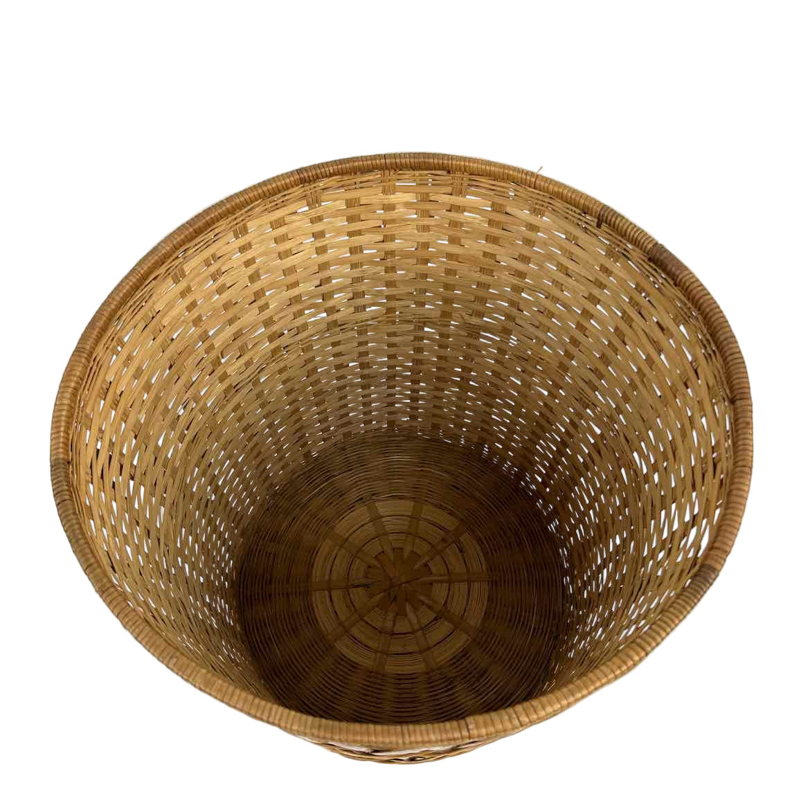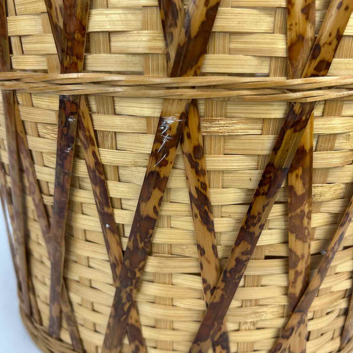 Large woven wicker basket with tortoise shell rattan X pattern around the sides, in very good vintage condition with some wear from age as shown. See photos for loose/missing tortoiseshell pieces.