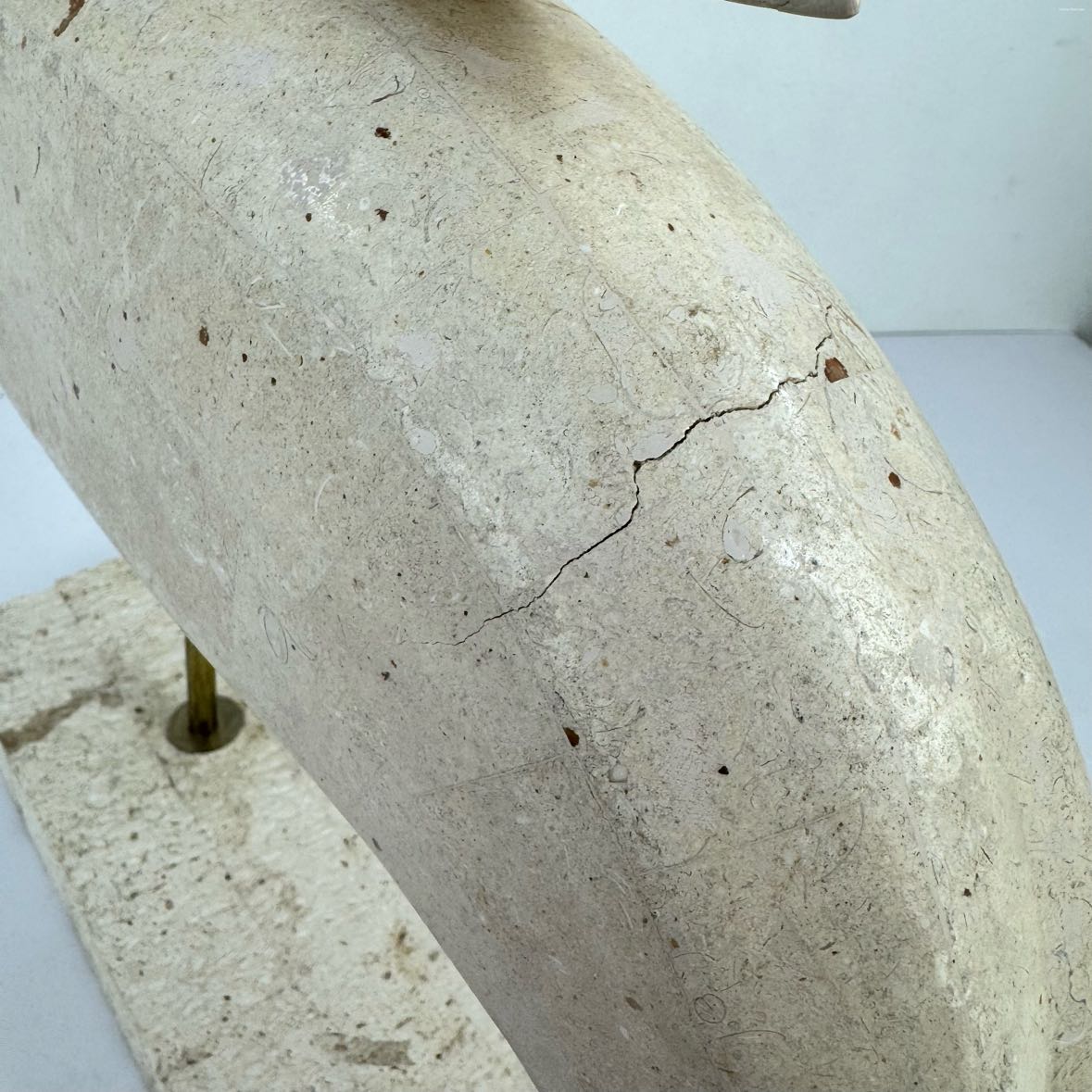 Modern toucan bird sculpture in travertine veneer with limed pencil reed and a brass rod, in very good vintage condition with some stress cracks as shown. Has a label underneath with a logo that says Made in Phillipines. Contact for shipping.