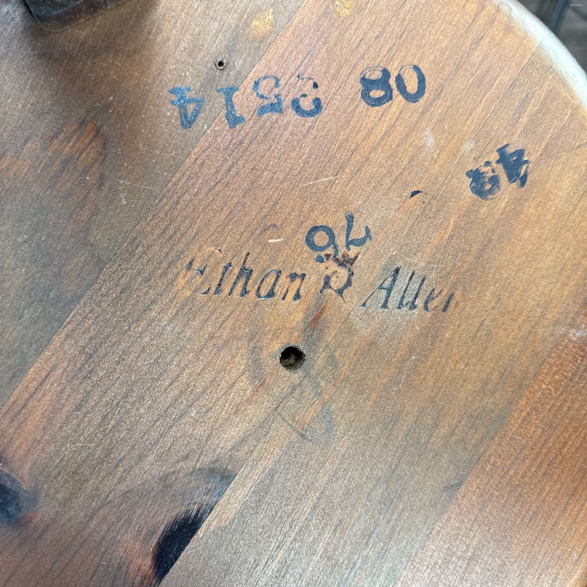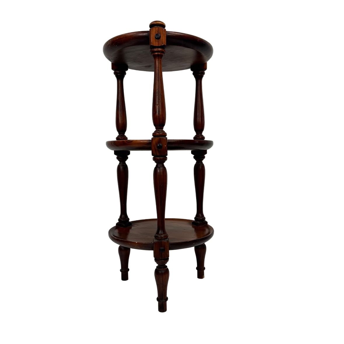 Three tier round plant stand pedestal table with a warm rich stain, some finish wear on the top and water rings from planters, but sturdy and still very useful around the house. Has a small amount of wobble.
