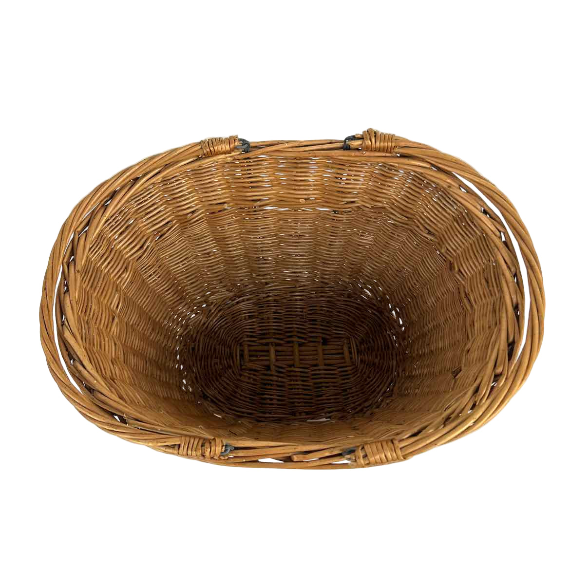 Metal framed basket that looks like a bike basket or farmers market shopping basket with hinged handles, in excellen vintage condition with a mid-tone stained wicker woven texture.