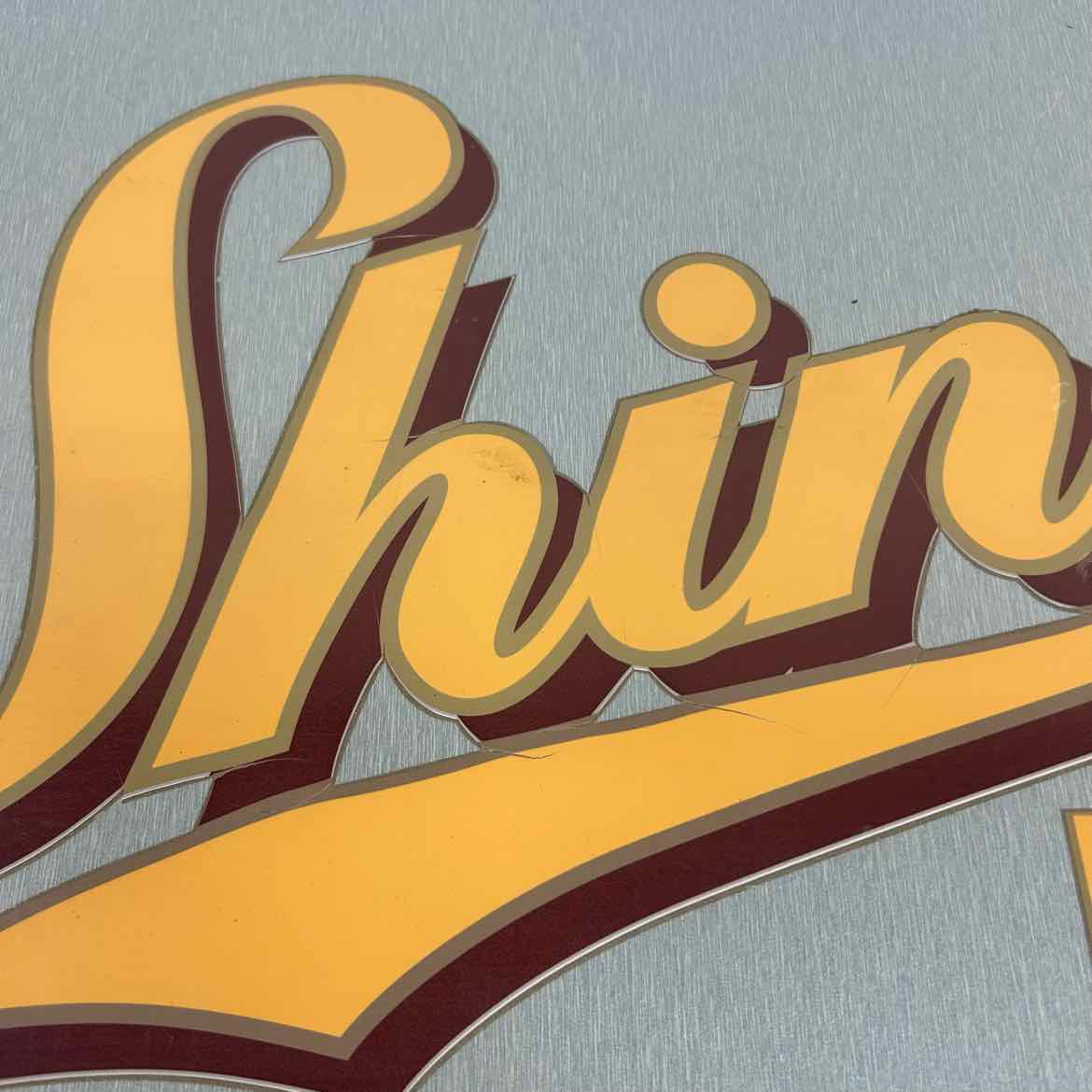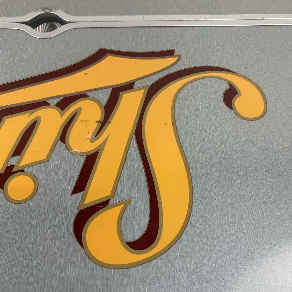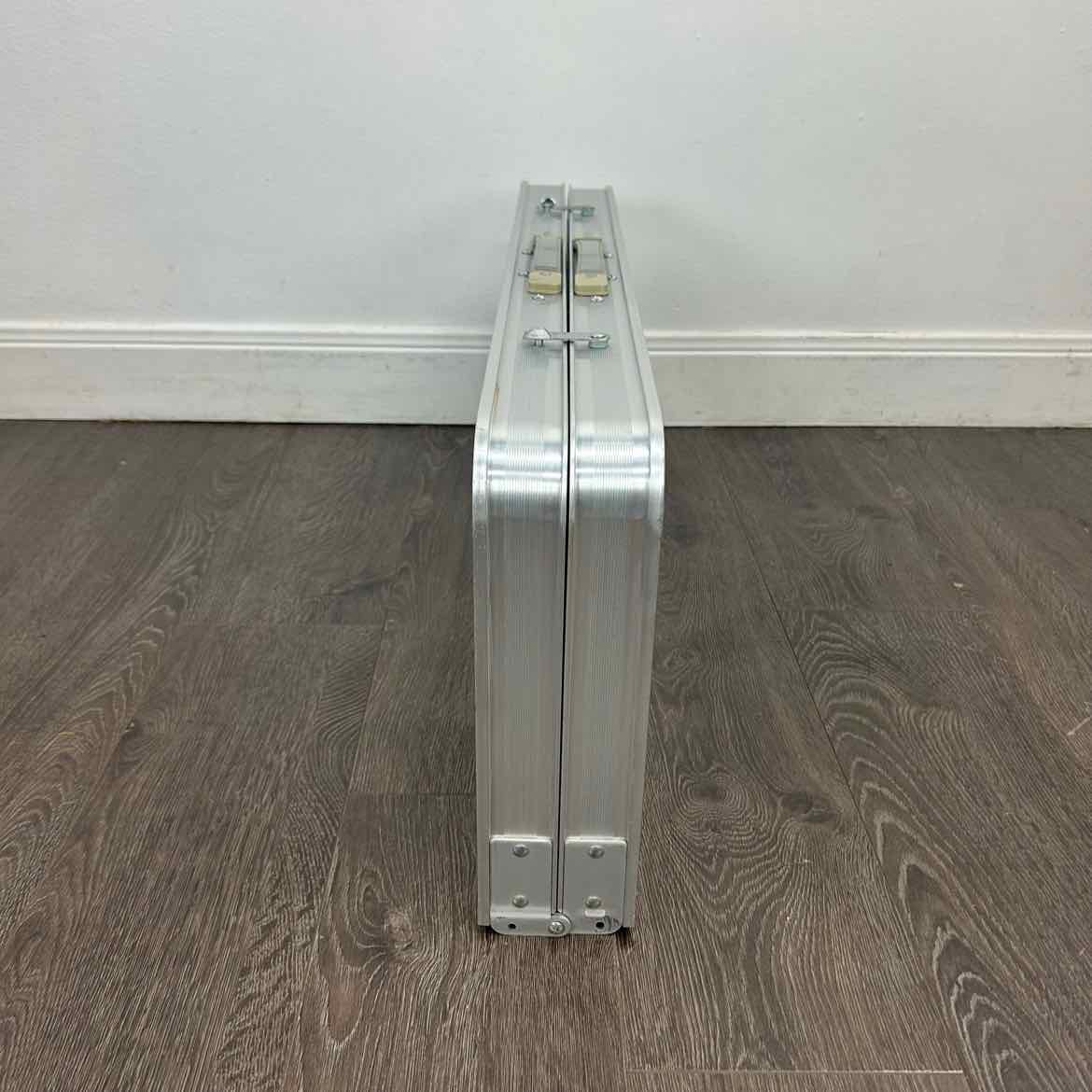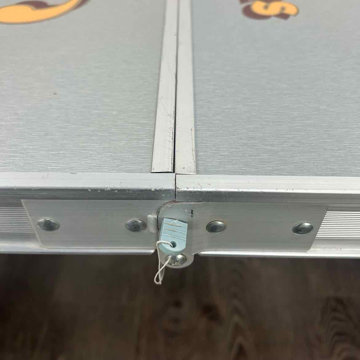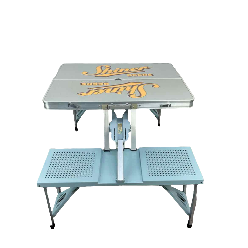 Aluminum cambping picnic table set that folds into a small suitcase and unfolds with four seats. It has vinyl decals on the tabletop with the Shiner beer logo and is in very good vintage condition with one of the two pins missing that fit in the top.