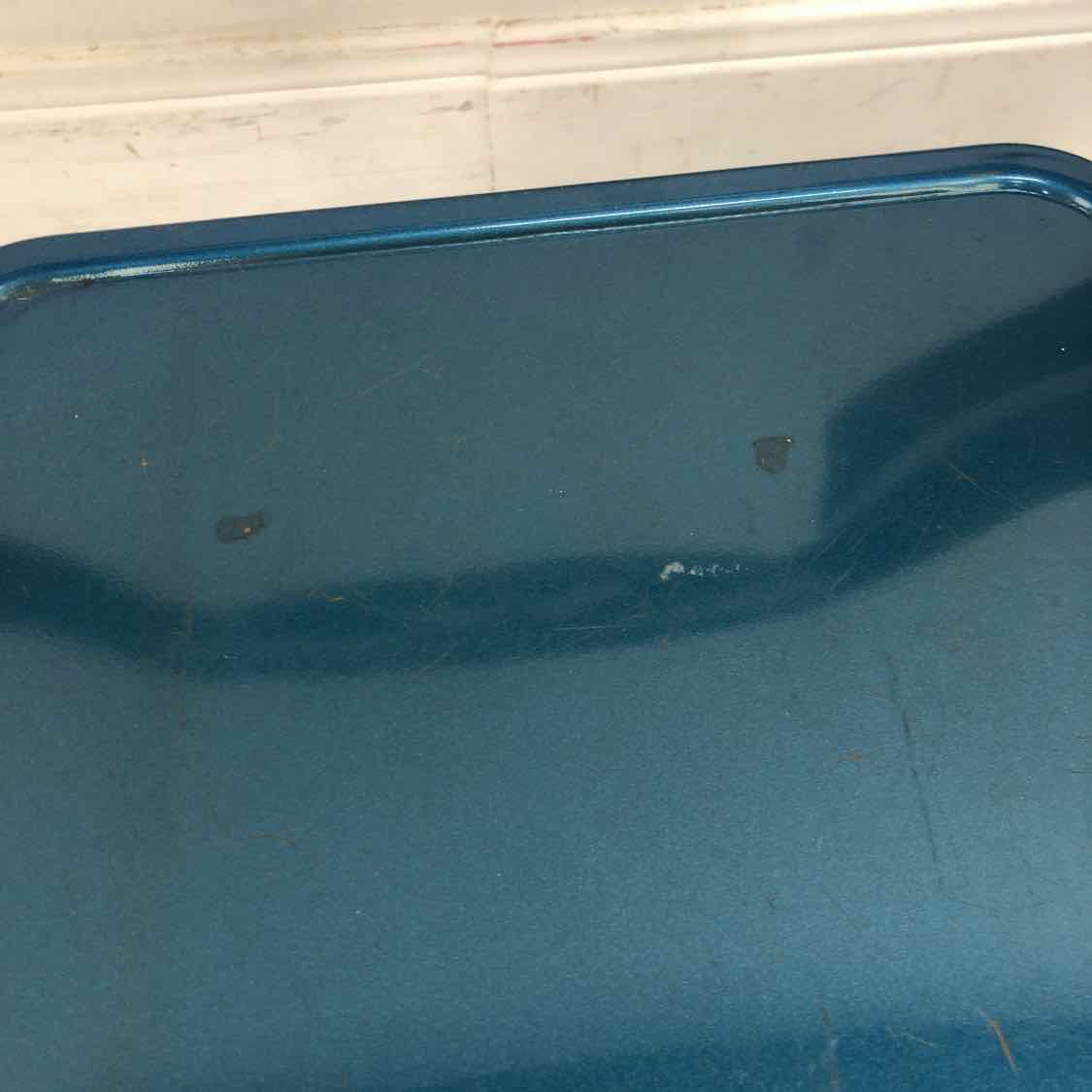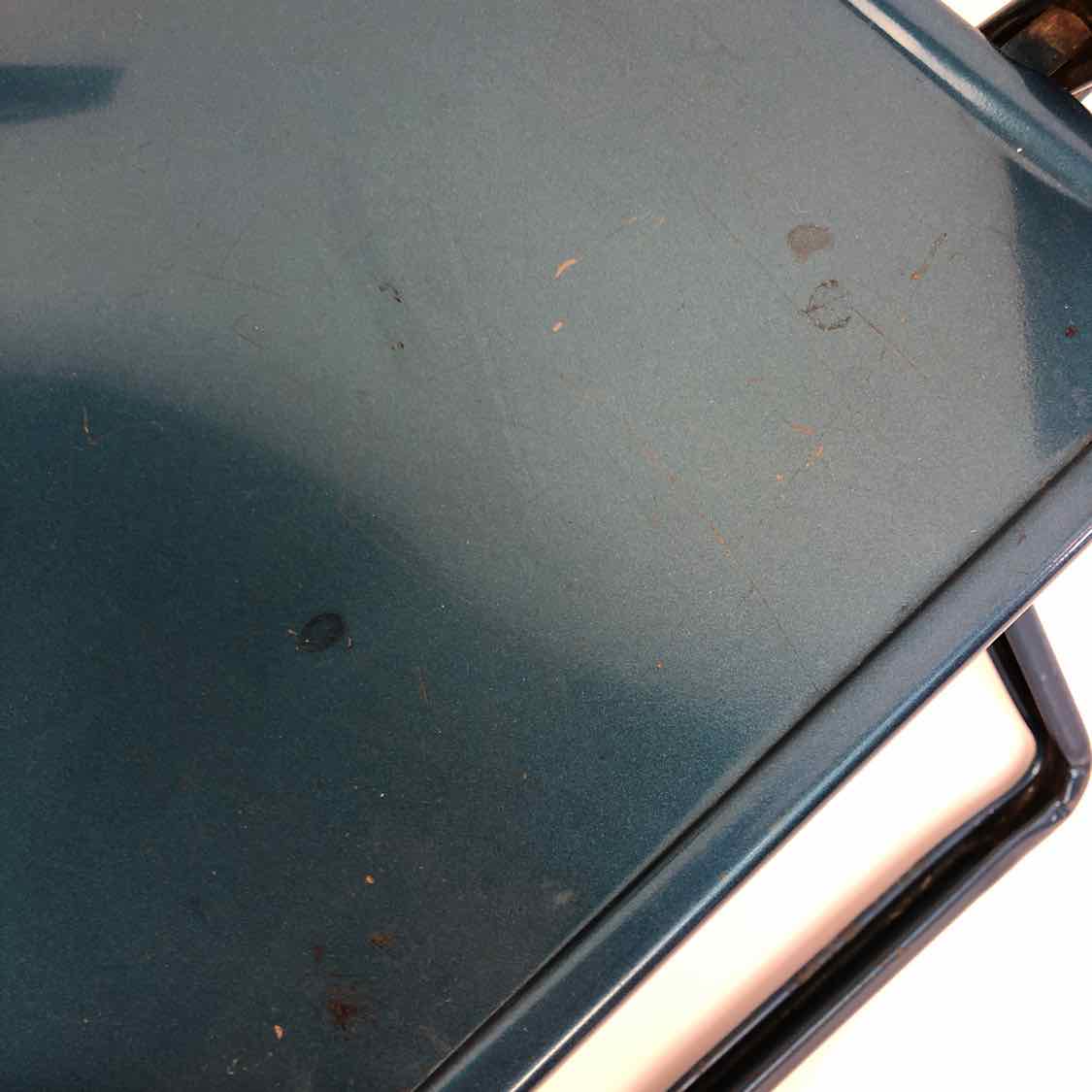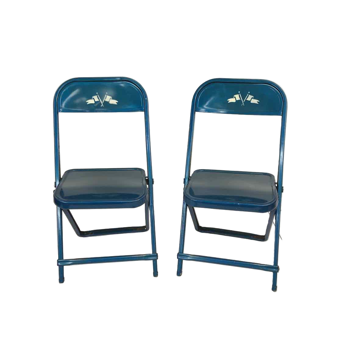 PAIR small children's folding chairs made of blue metal with white screen printed designs on the backs. In very good vintage condition and great for visiting grandkids.