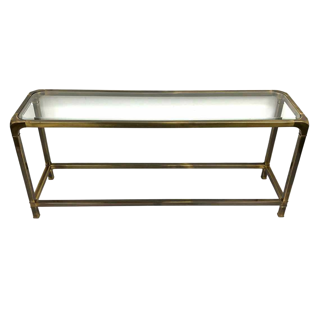 Long brass sofa table or entryway table with a beveled glass inlaid top, in very good vintage condition and sturdy, with darker patina on the bronze finish and some scratches on the glass.