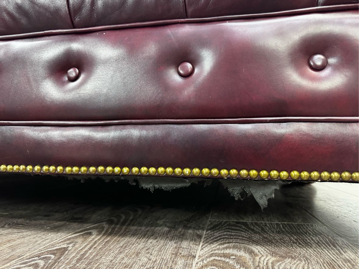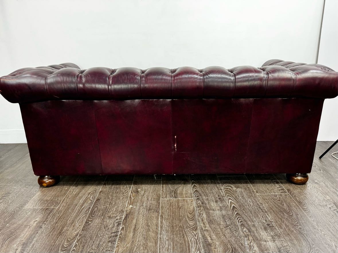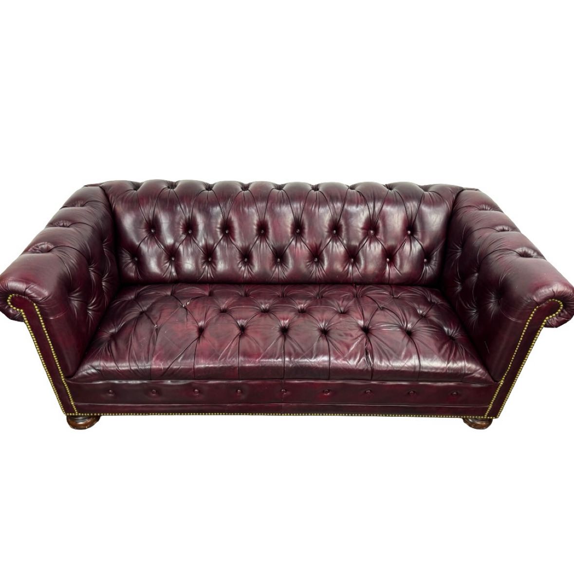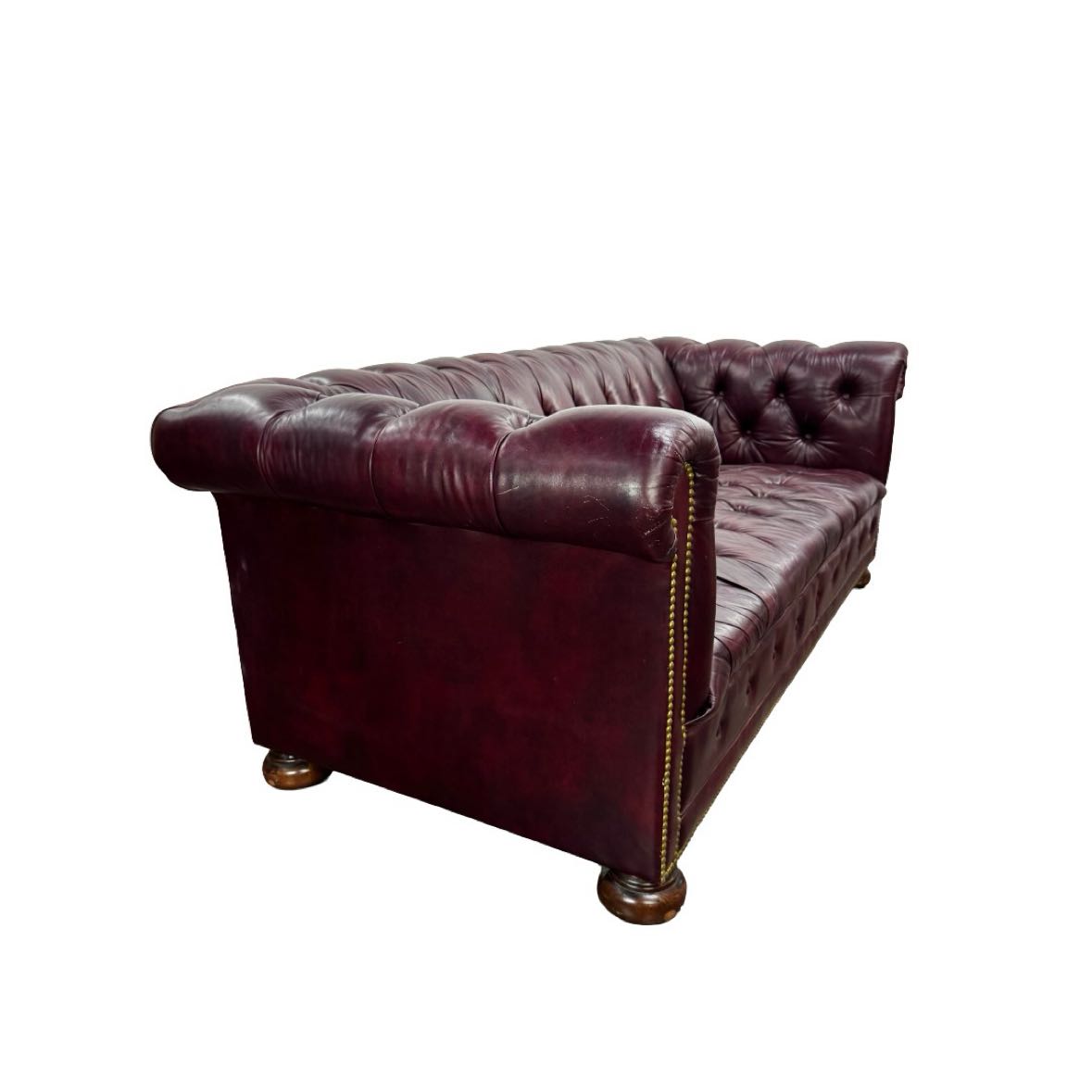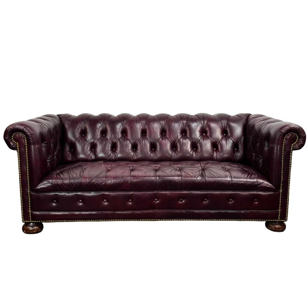 Burgundy leather Chesterfield sofa in with nailhead trim and wooden bun feet, in overall good vintage condition & sturdy, with a few buttons torn out, some crackling and scratches to the leather from age.