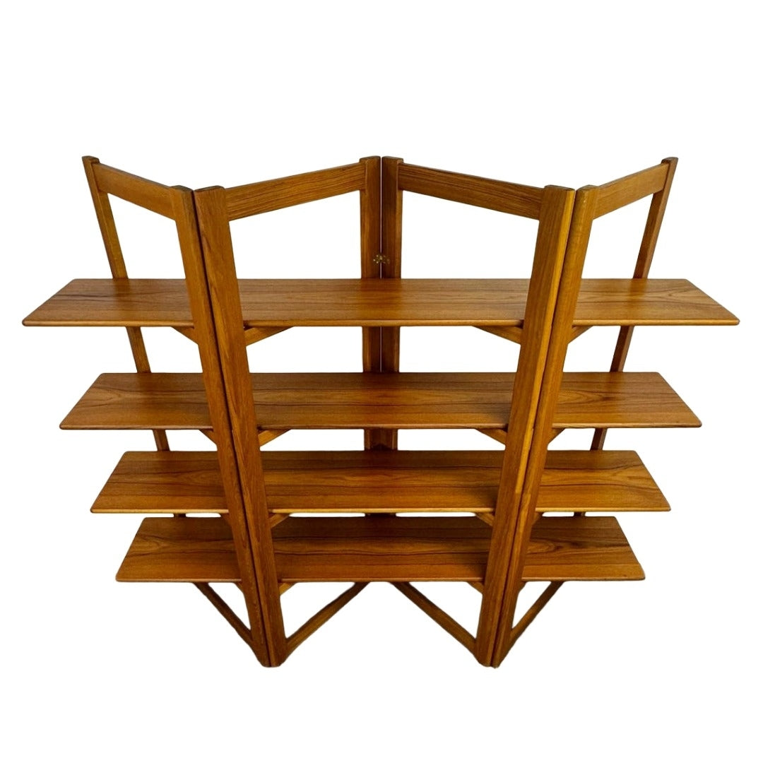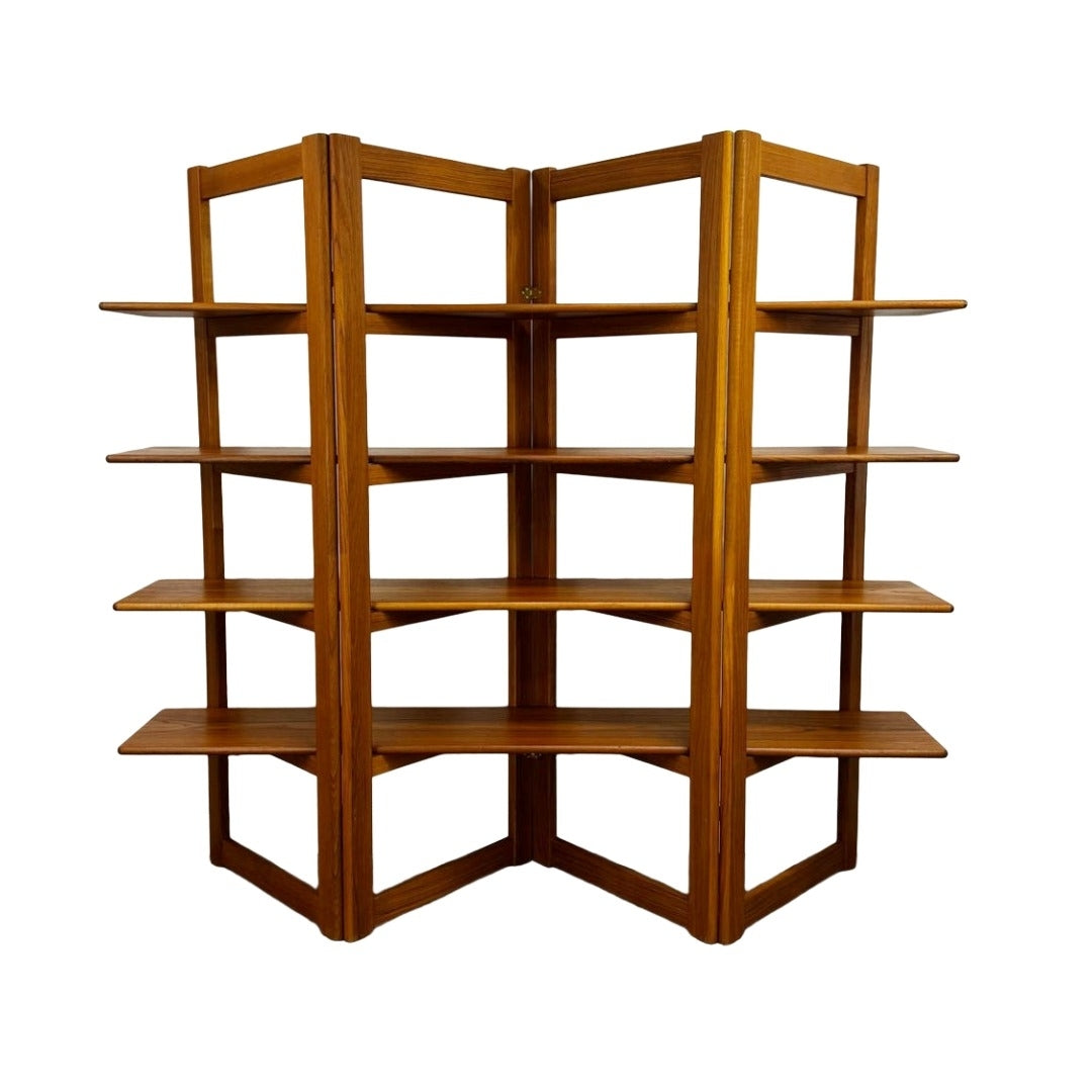 Fabulous Danish modern teak shelf room divider with all teak construction, four removable shelves & a foldable frame that can be made compact for transport, in excellent vintage condition c. 1980s Thailand.