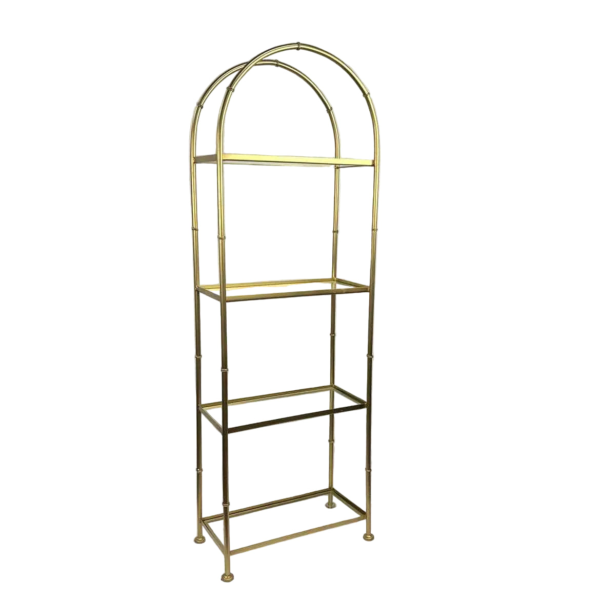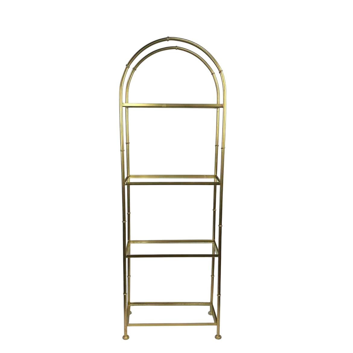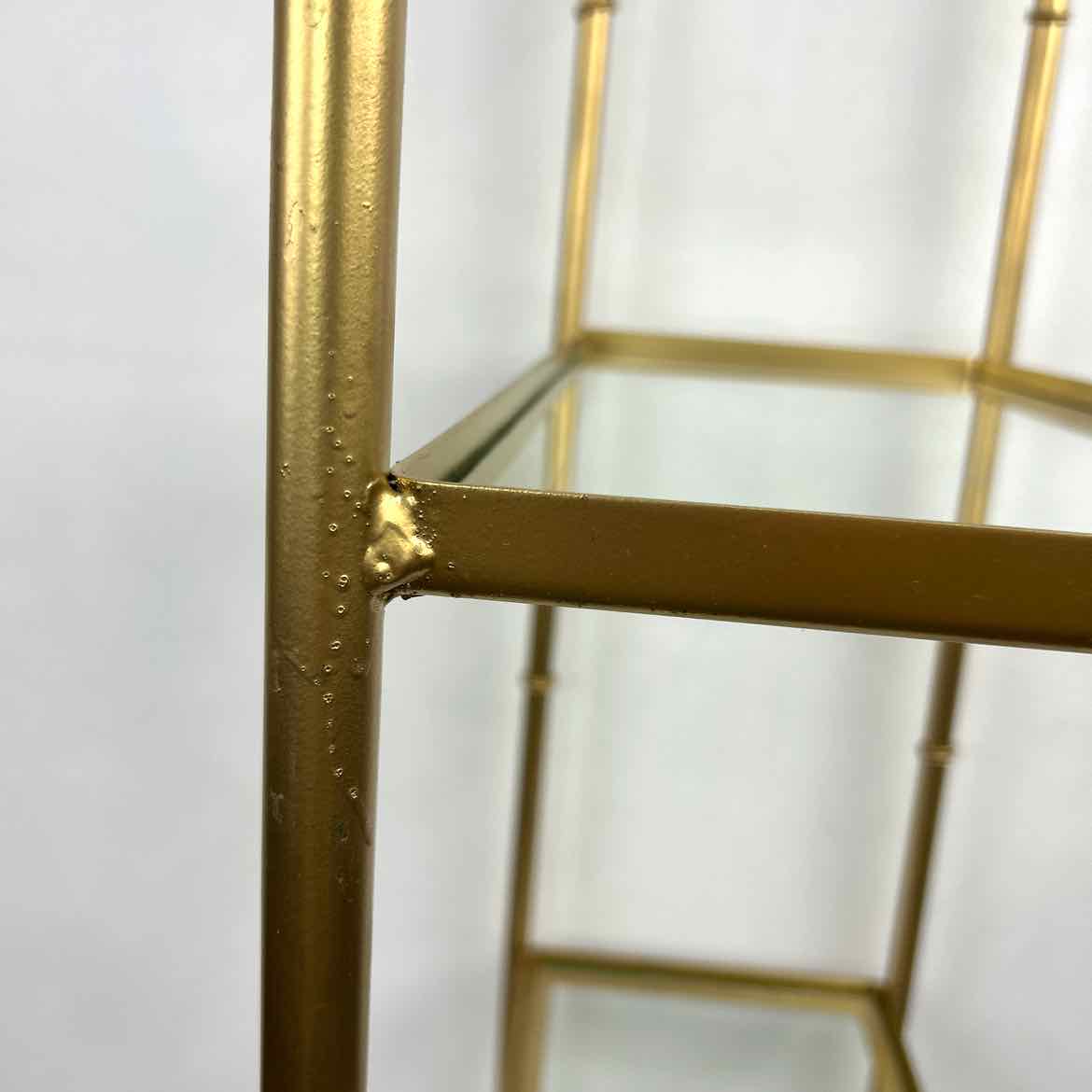 Faux rattan gold metal shelf with glass shelves, in good vintage condition with some chips to the glass as shown. The gold metal has some texture that resembles gold leaf.