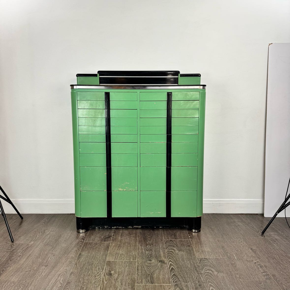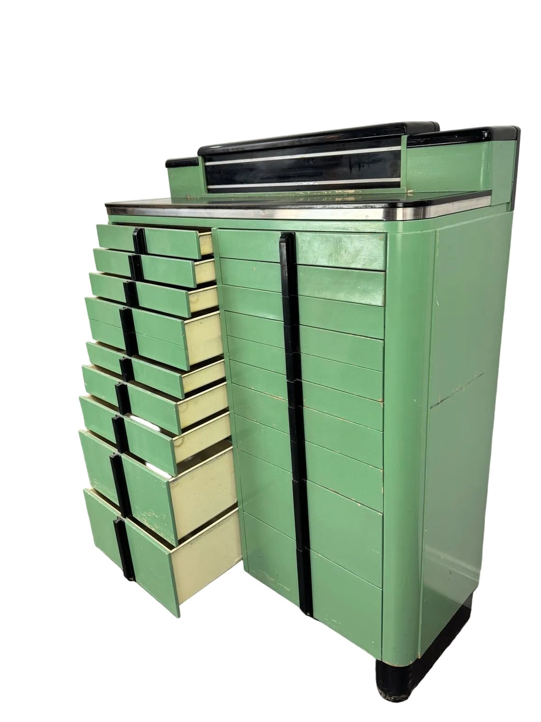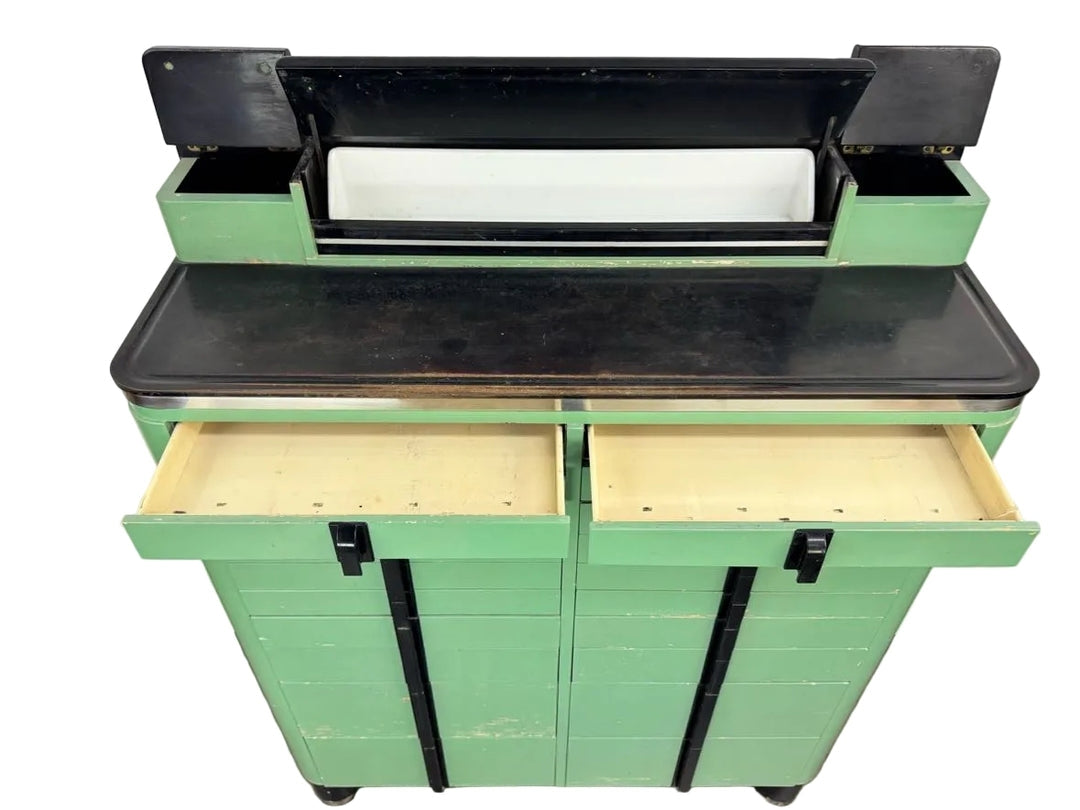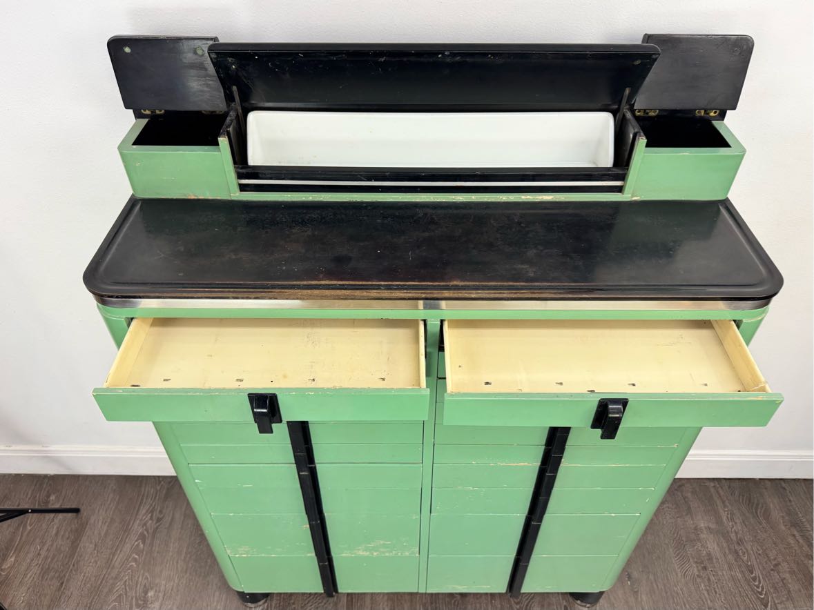 Vintage wood & metal dental cabinet with tiny drawers, in overall very good vintage condition with some finish wear to the green paint. This one has wood drawer fronts, and the top cubby lid opens well with a milk glass tray inside.