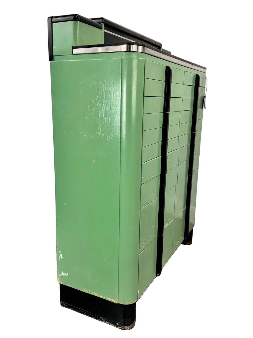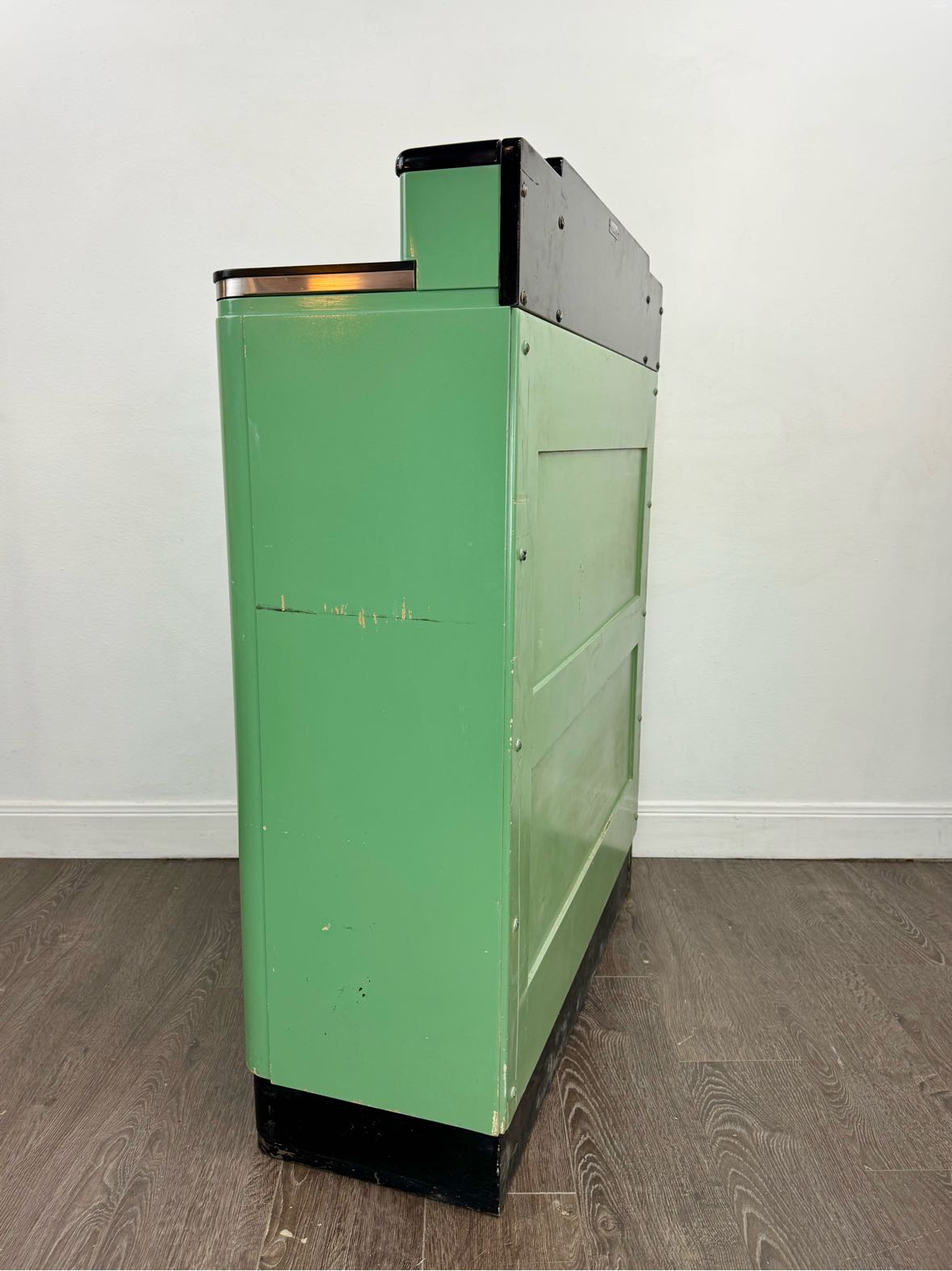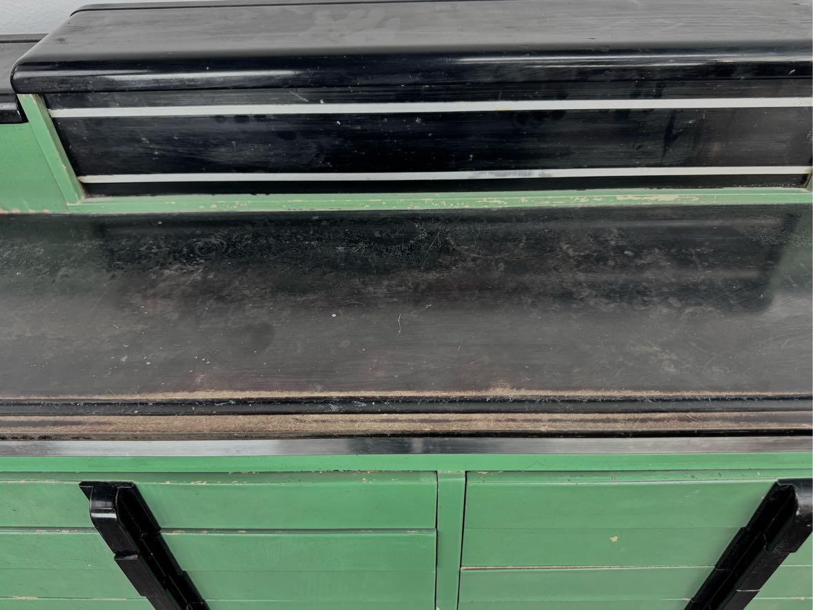 Vintage wood & metal dental cabinet with tiny drawers, in overall very good vintage condition with some finish wear to the green paint. This one has wood drawer fronts, and the top cubby lid opens well with a milk glass tray inside.