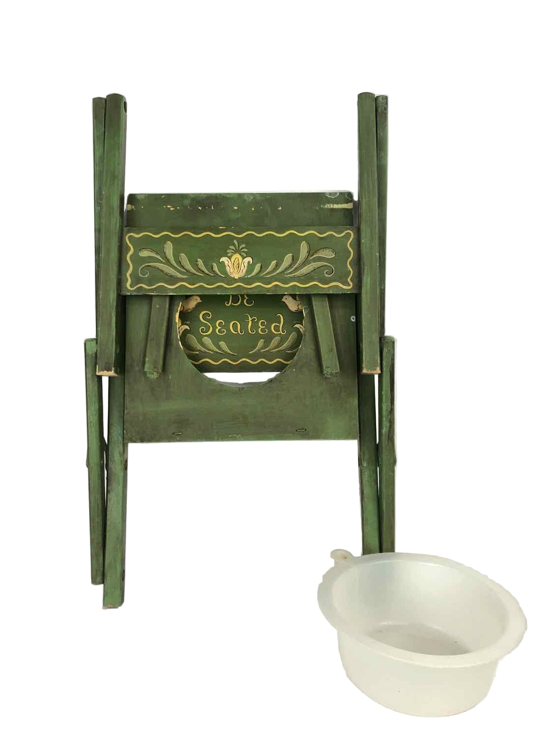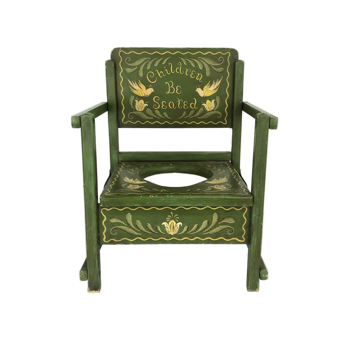 Vintage wooden kids potty training chair with hand painted designs including Children Be Seated in curly letters. Includes a plastic potty dish in the seat.