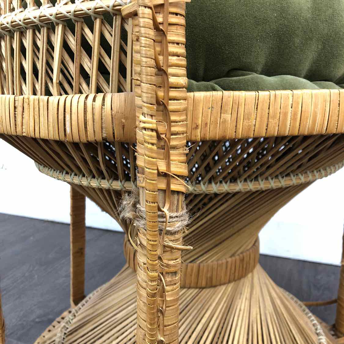 Large woven peacock chair with a green cushion, sturdy and in good vintage condition with a few small breaks in the weave as shown. These are amazing for a statement piece in the home, or as a prop in a photography studio. Without cushion, seat is 18.25".