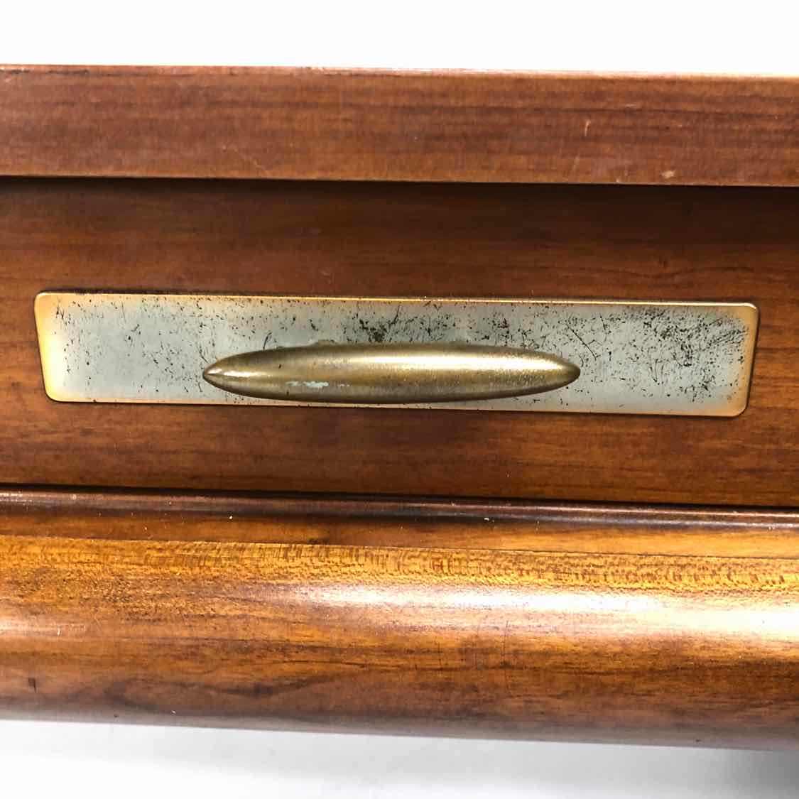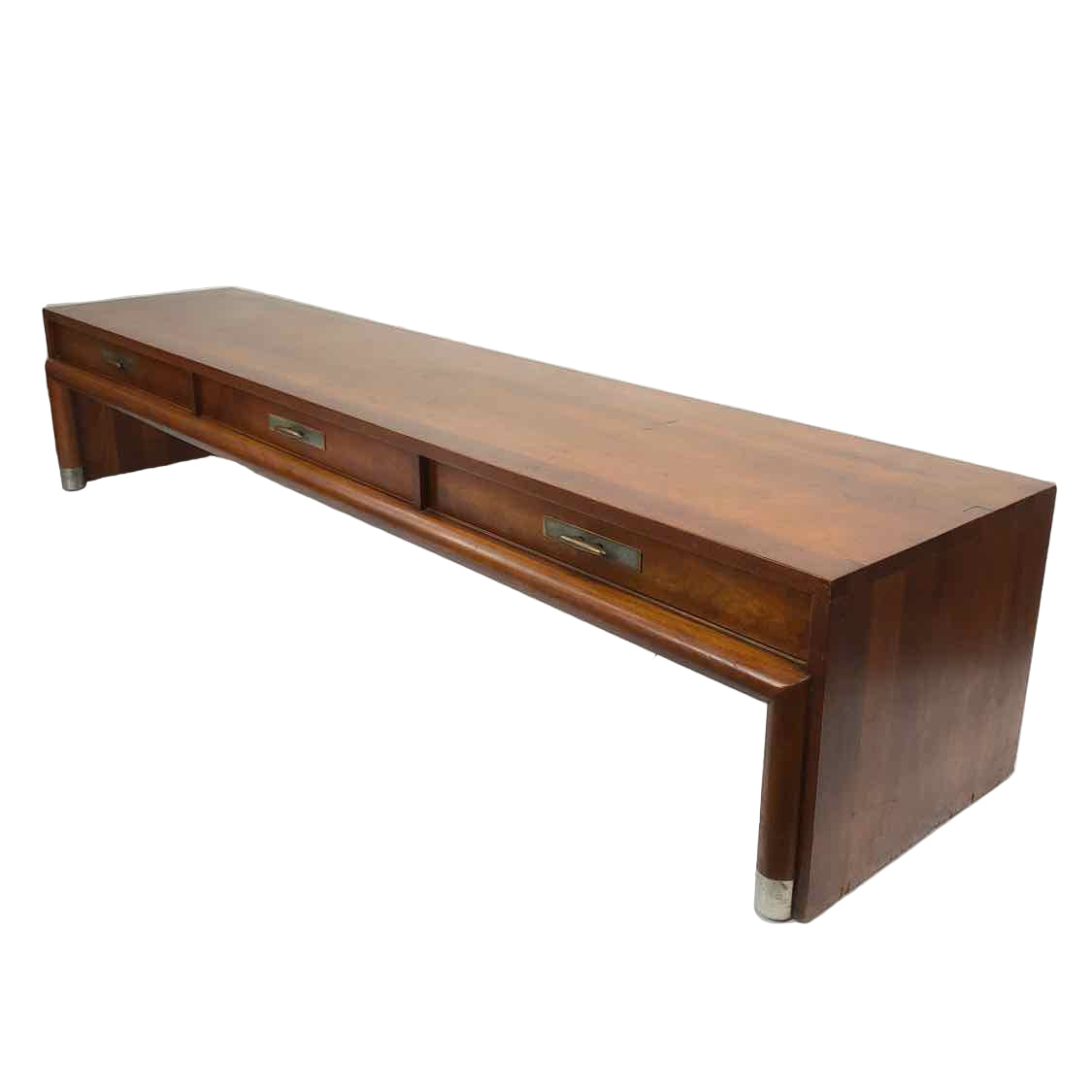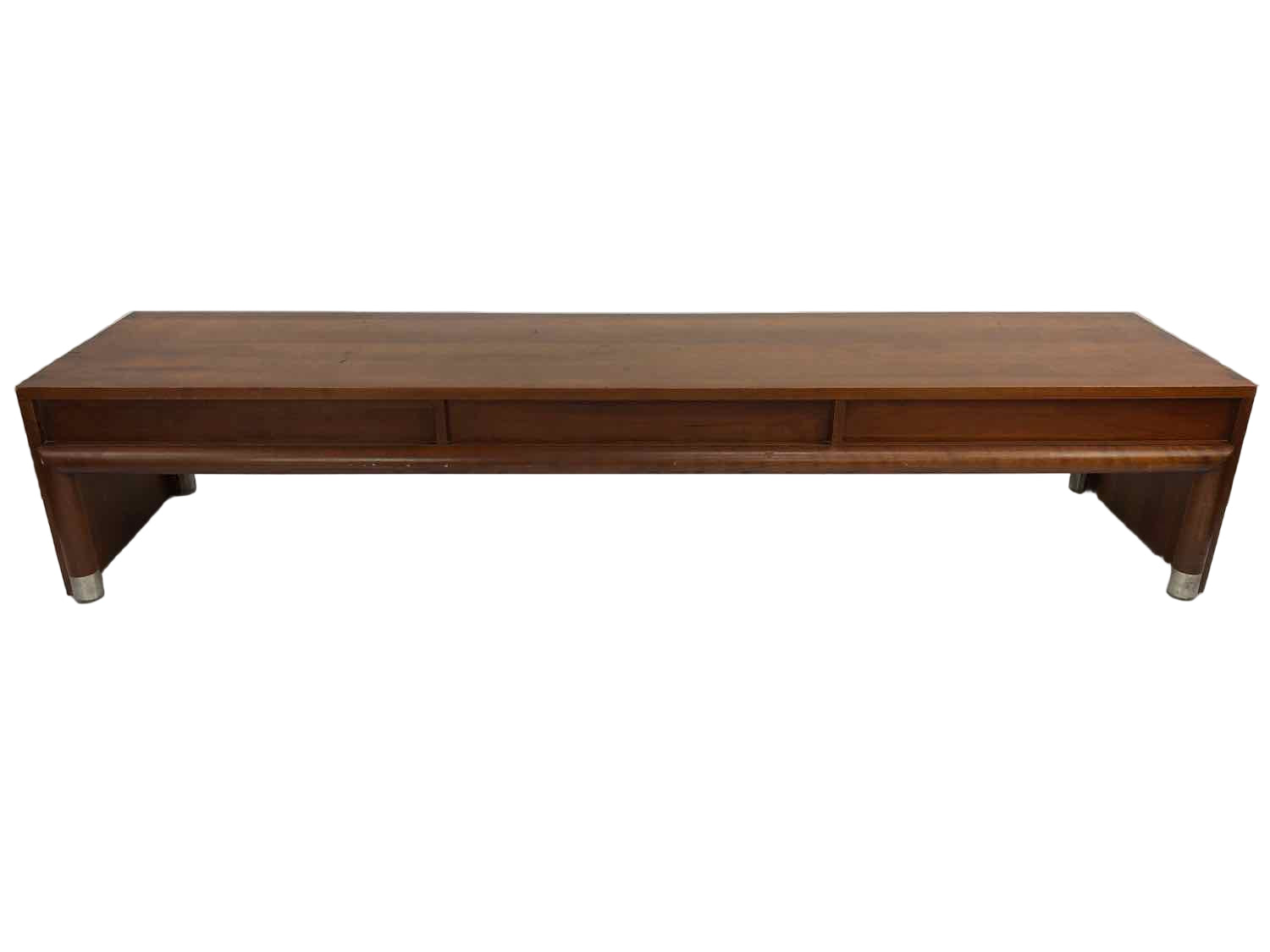 Mid-century high end solid wood 3-drawer coffee table with cool hardware and an unusual size that makes it perfect for a narrow space. Made by Willett with solid cherry drawer fronts. The hardware has patina, but this is a great piece for the ages.