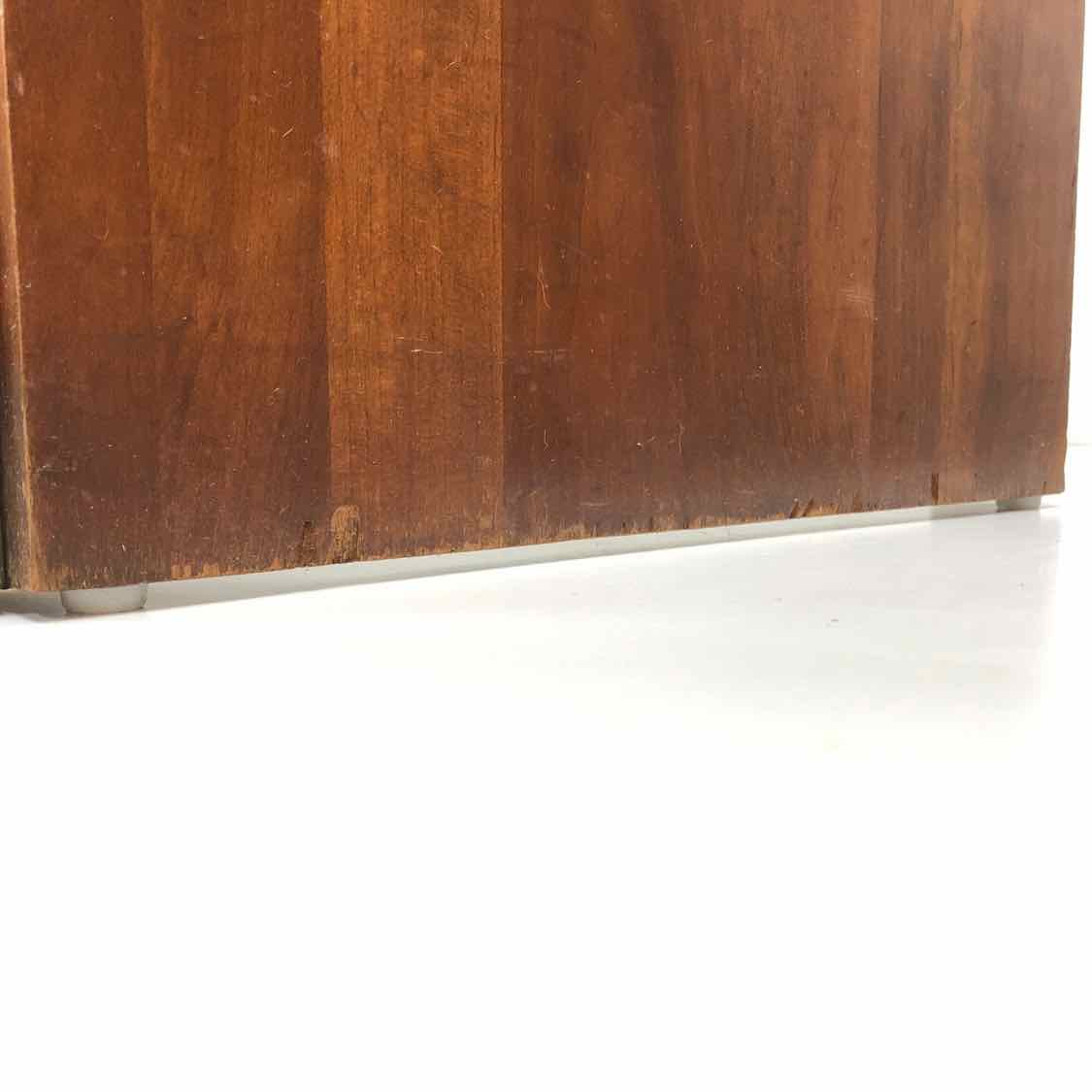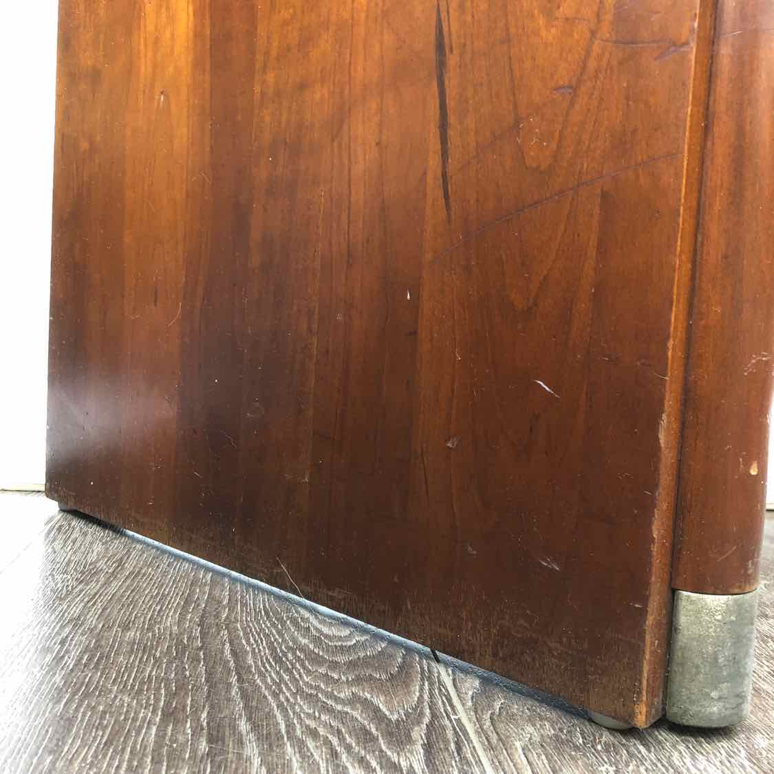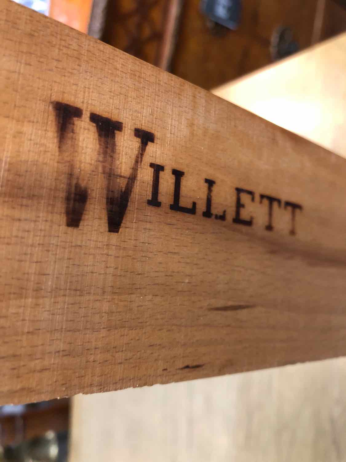 Mid-century high end solid wood 3-drawer coffee table with cool hardware and an unusual size that makes it perfect for a narrow space. Made by Willett with solid cherry drawer fronts. The hardware has patina, but this is a great piece for the ages.