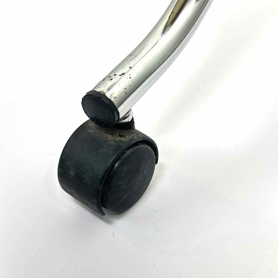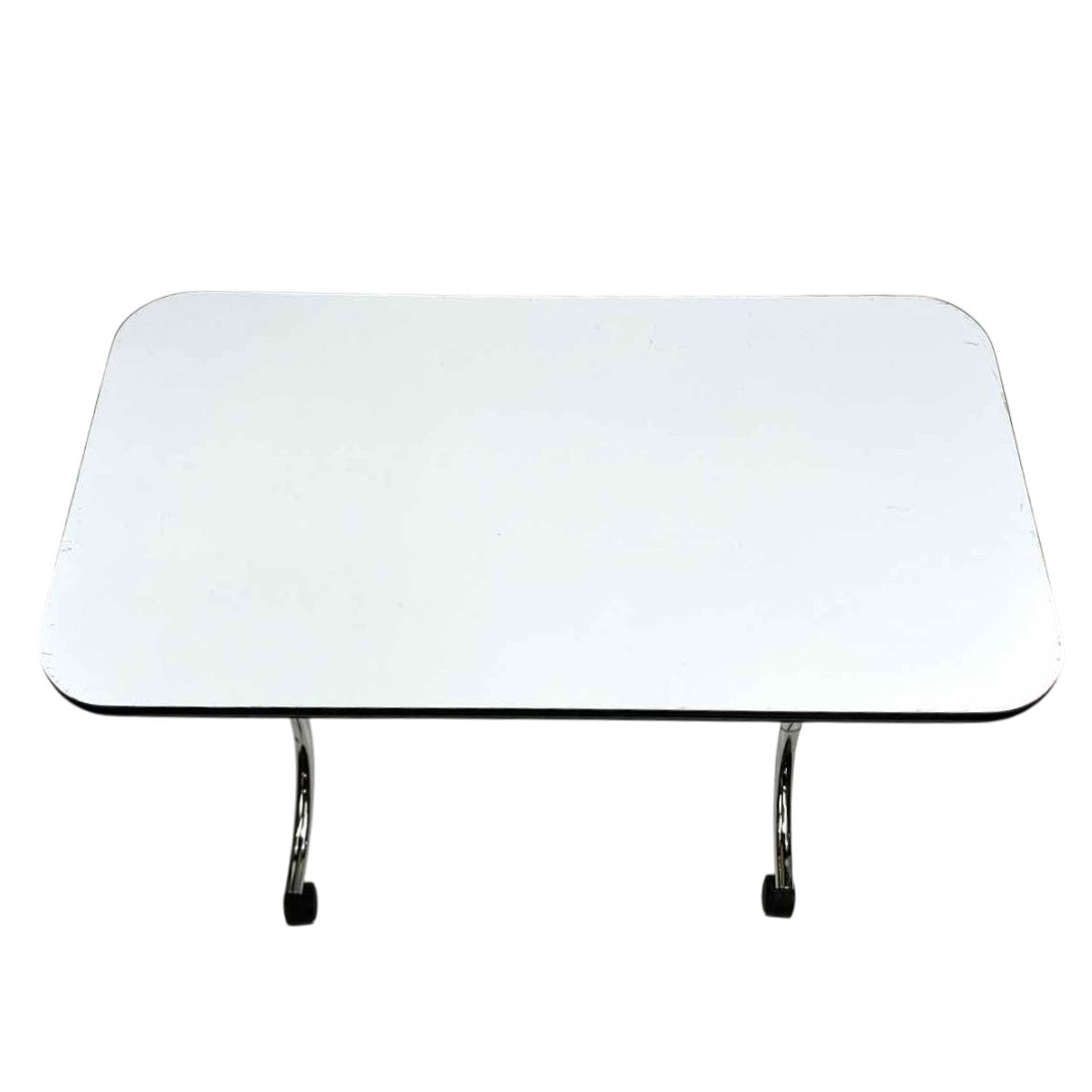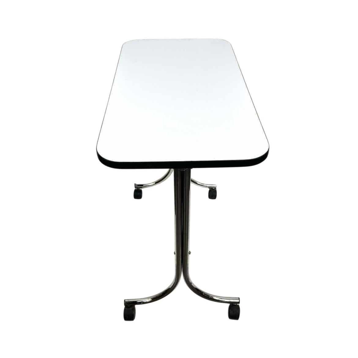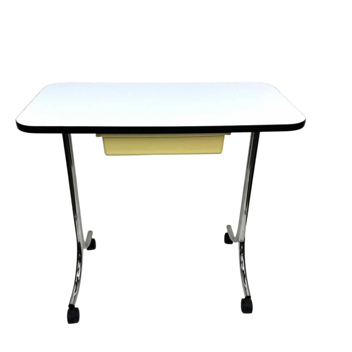 Formica top manicure table with a single plastic drawer, chrome legs, and black plastic casters. In good vintage condition and clean. Doesn't roll super well, but can be used as a small portable desk or work station.