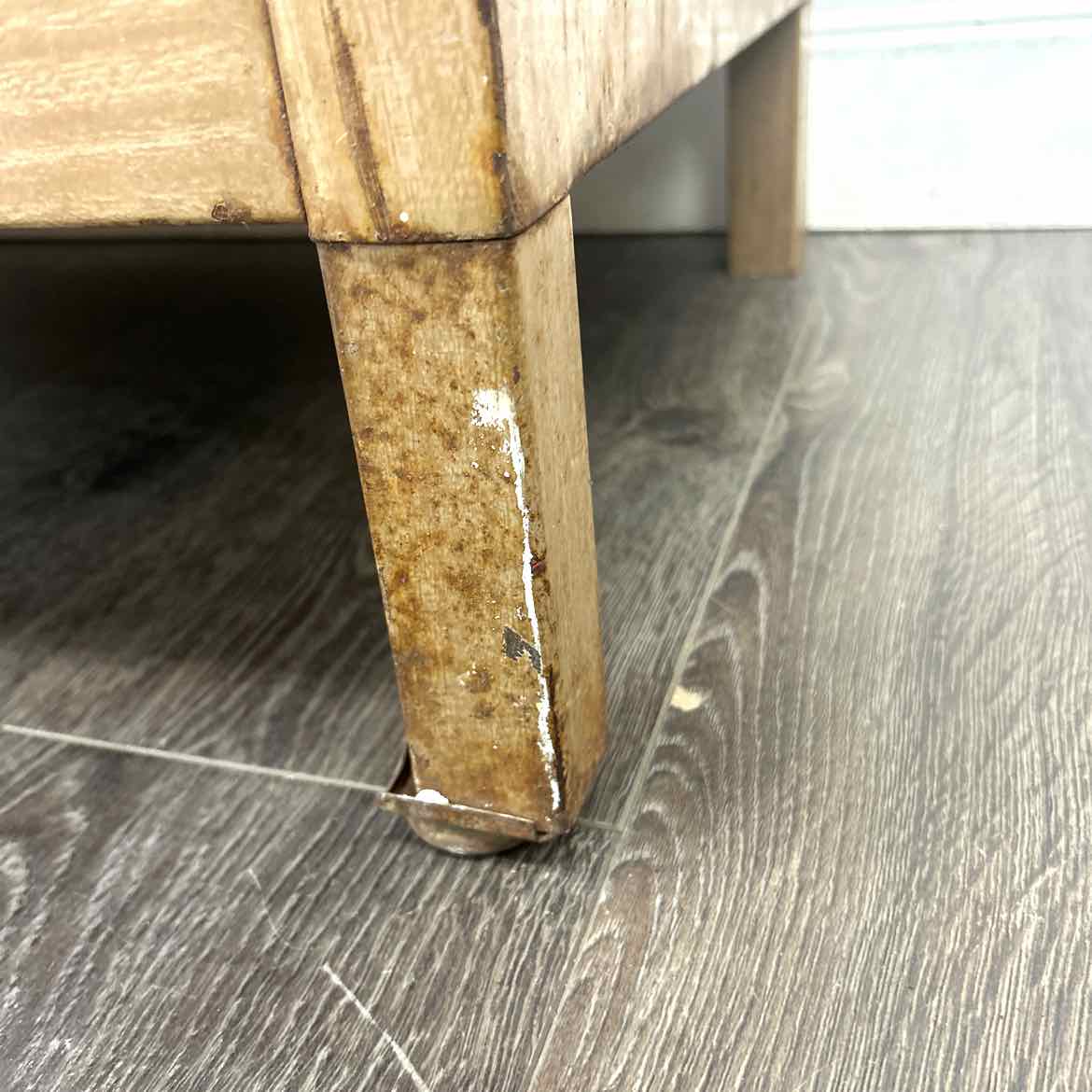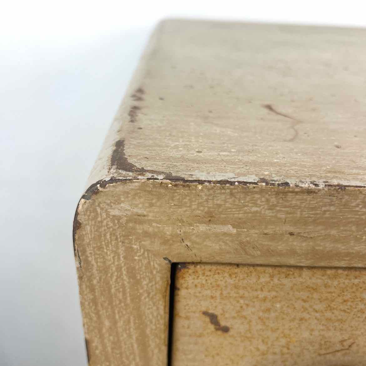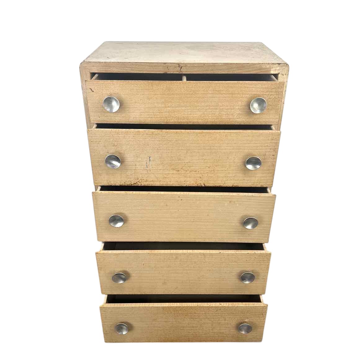 Faux wood 1930s metal chest of drawers by Simmons Furniture. This collectible piece has some finish wear from age, but is still cool looking and would look amazing refinished.