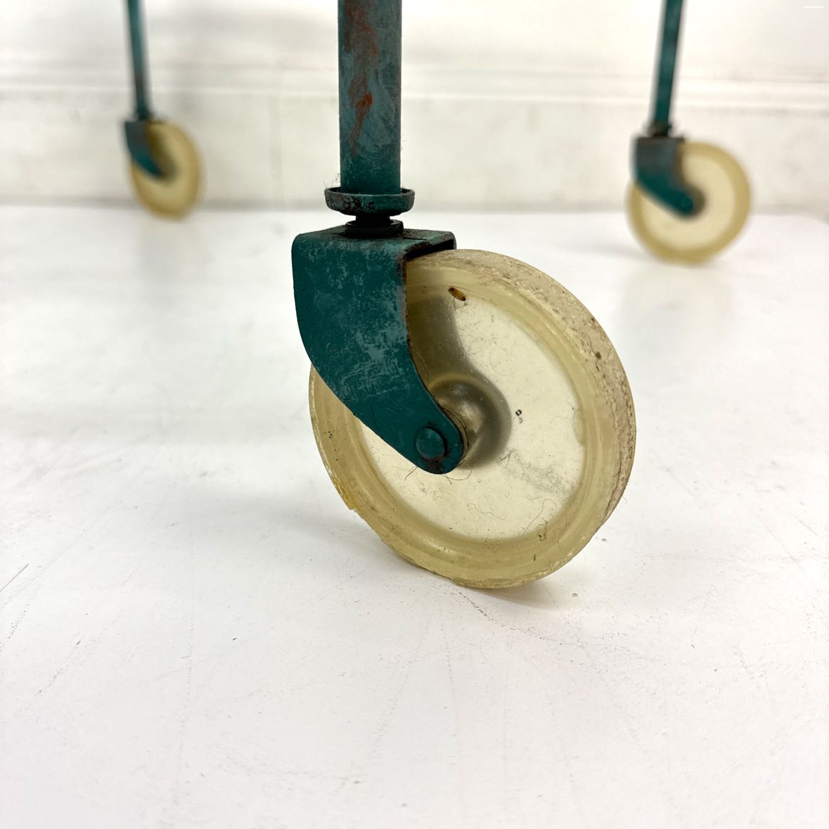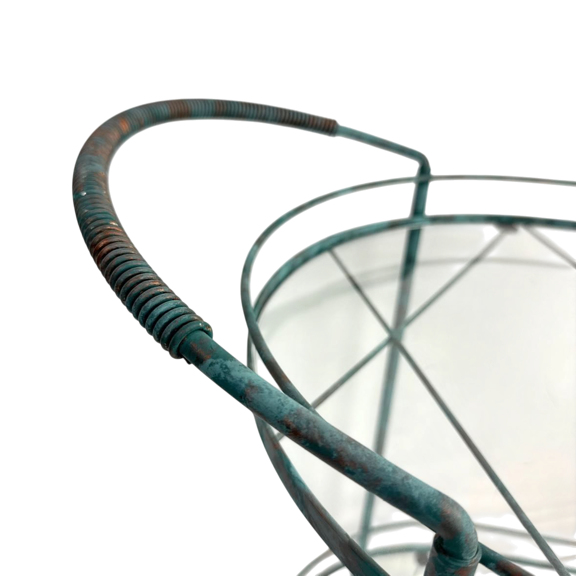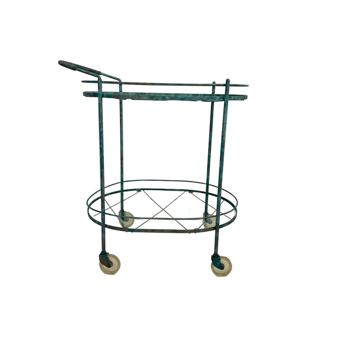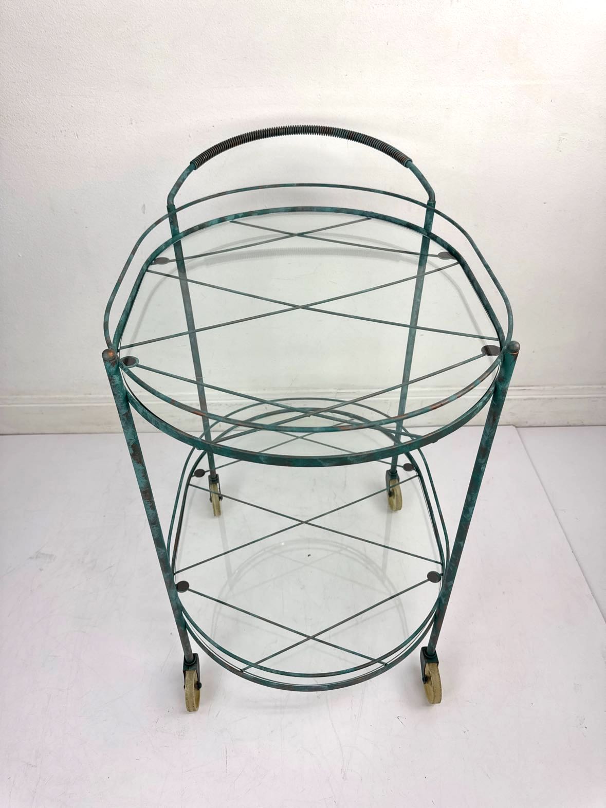 Vintage metal bar cart with two glass shelves and a verdigris green copper patina paint job. The lower piece of glass has a rim chip, but it is in otherwise very good vintage condition.