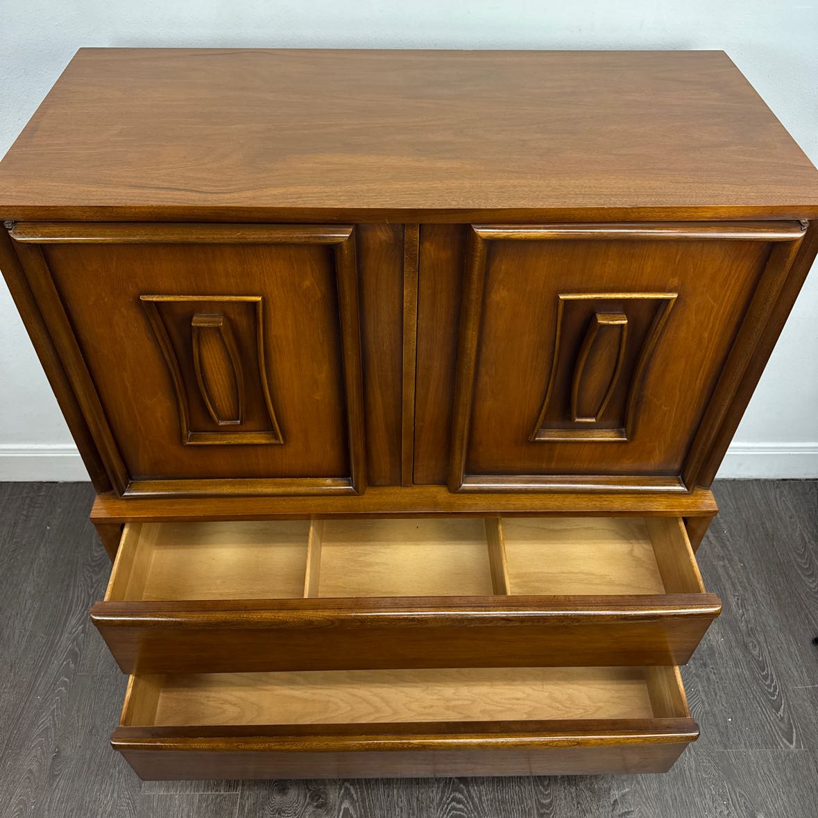 Rare mid-century modern walnut 9-drawer gentleman's chest with sculptural details on the door fronts, made in the USA. Fashion Forward by Unagusta, solid wood with some finish wear as shown on the top but in otherwise very good vintage condition.