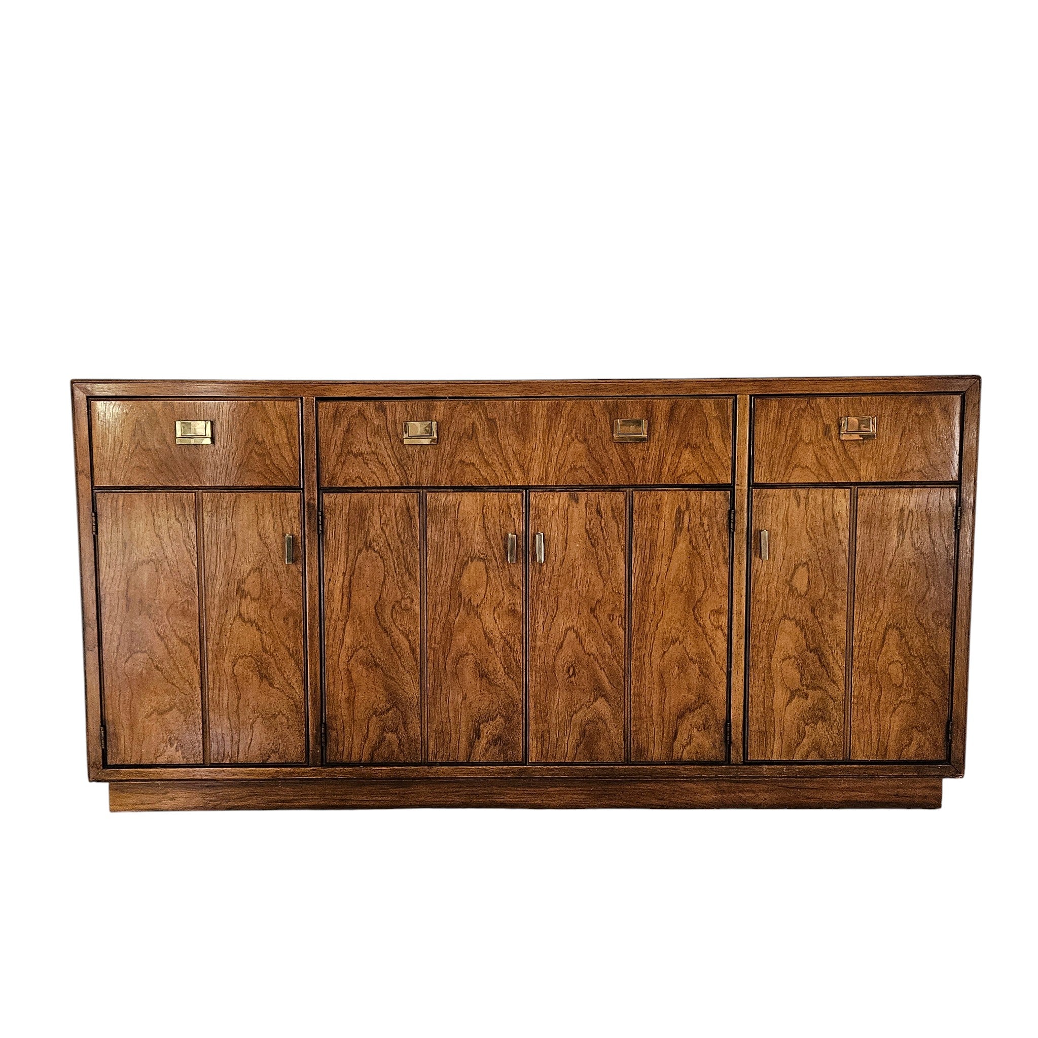 OFF-SITE | Modern Drexel Consensus buffet with 6 drawers and two side cabinets with one removable interior shelf in each. The top center drawer has a removable felt lined silverware panel. In excellent vintage condition.