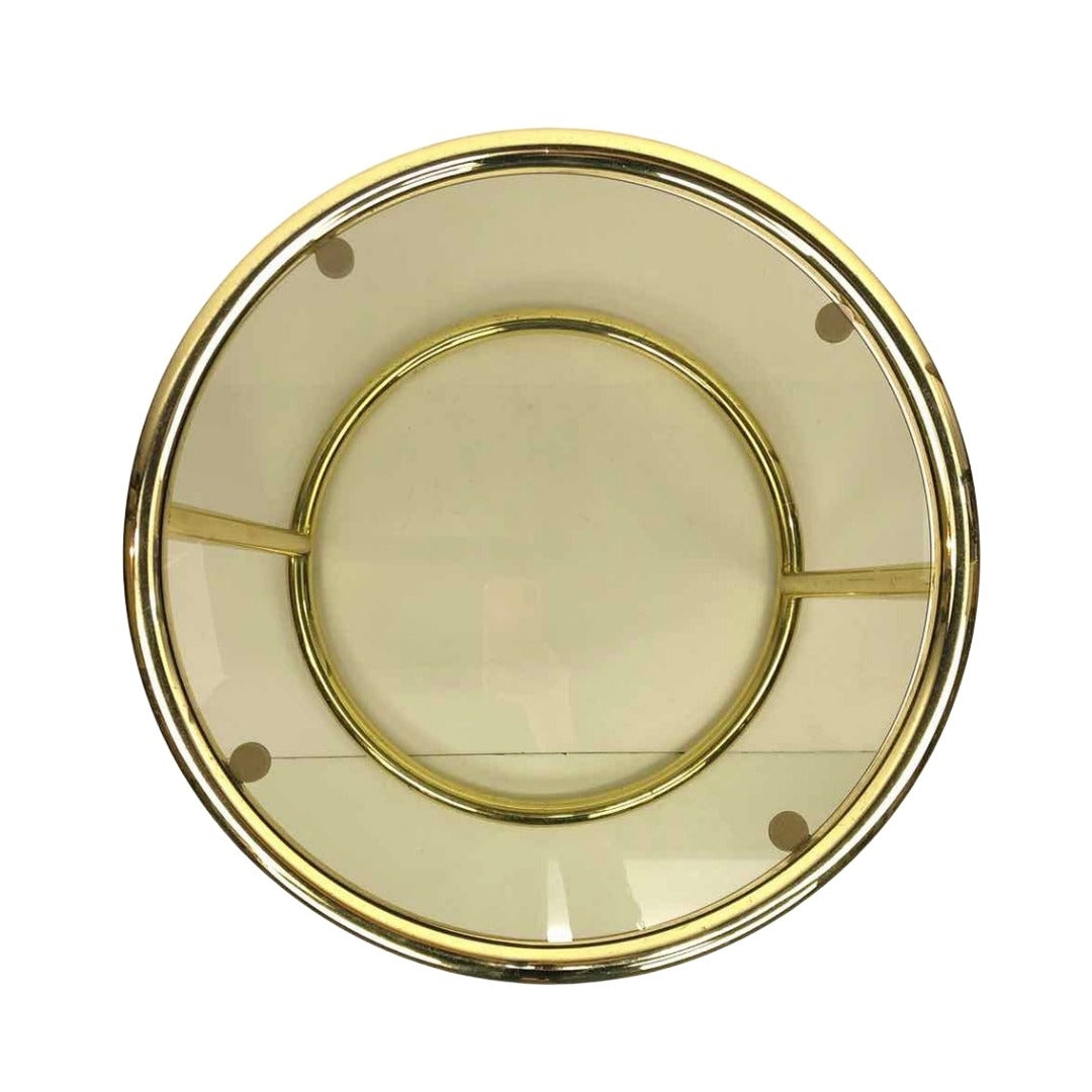 Round postmodern 1980s table made of bright gold metal tubing with an inset smoky glass top, in very good vintage condition with a few scuffs to the gold finish and no chips to the glass.