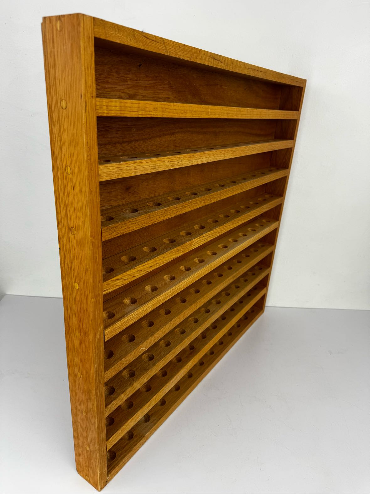 Solid oak golf ball shelf that could be repurposed for all sorts of things, like a shot glass collection, Legos, or crystals. In good vintage condition with some light wear from age. Very heavy. Contact for shipping.