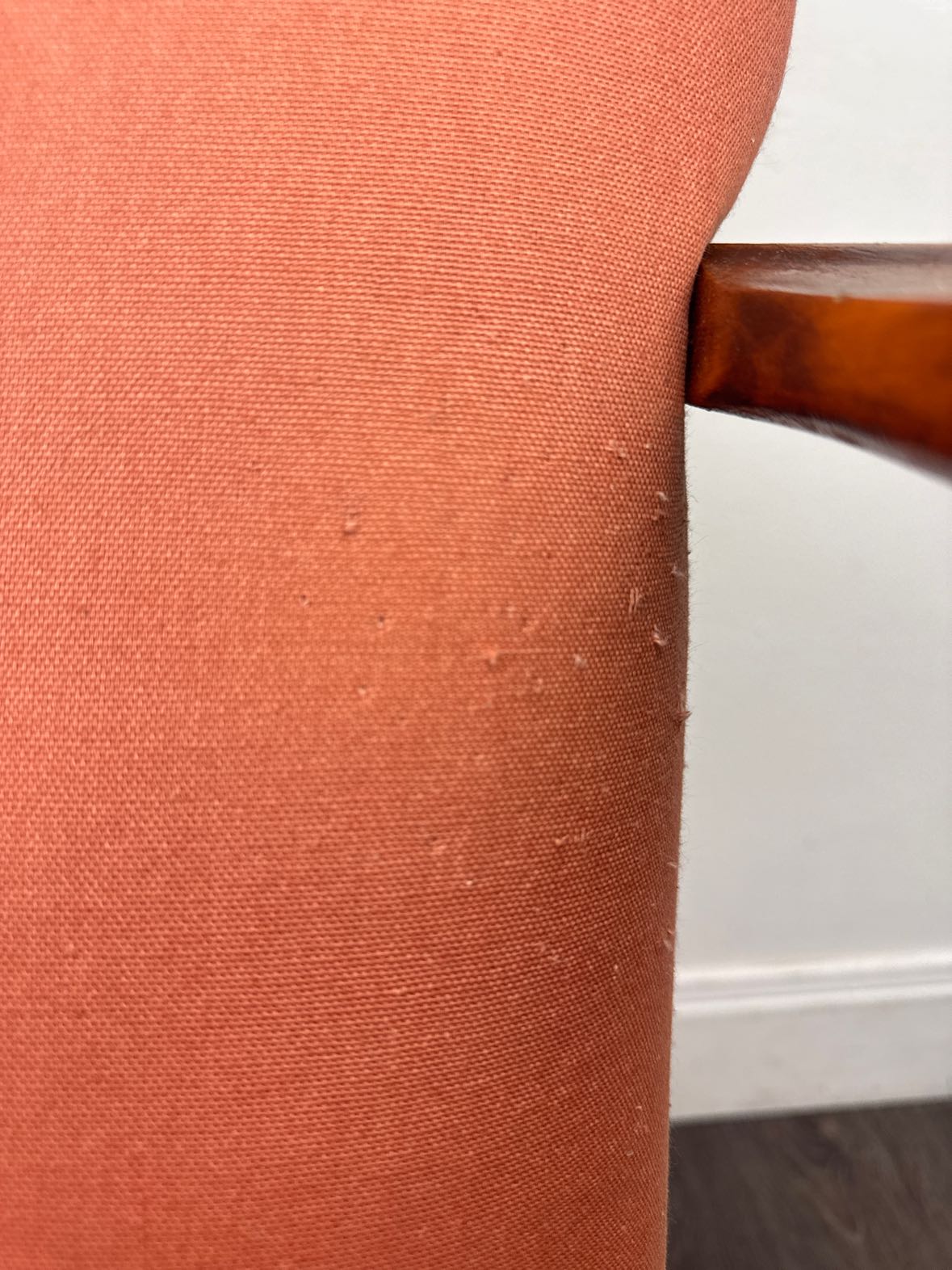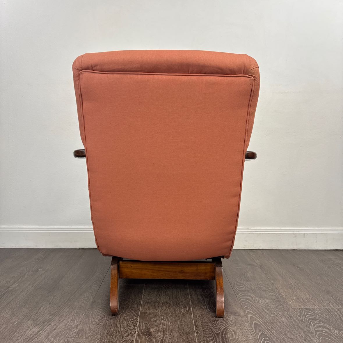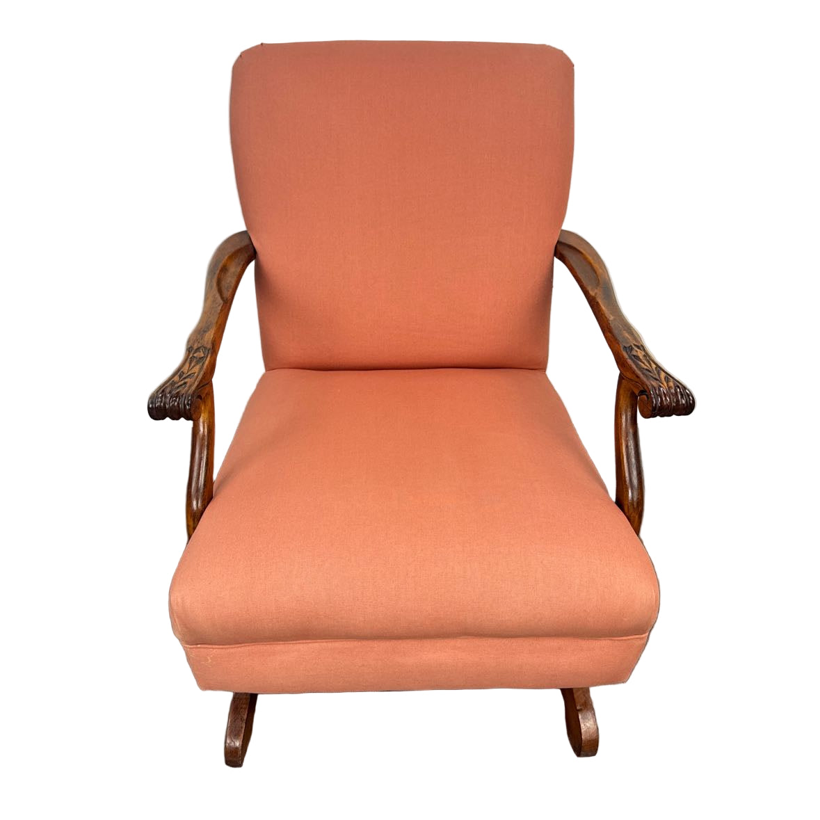 This vintage rocking chair has stationary feet, carved wooden arms, and a muted pink upholstery. It has some light wear from age, but it is in overall good vintage condition and sturdy. Very comfortable!