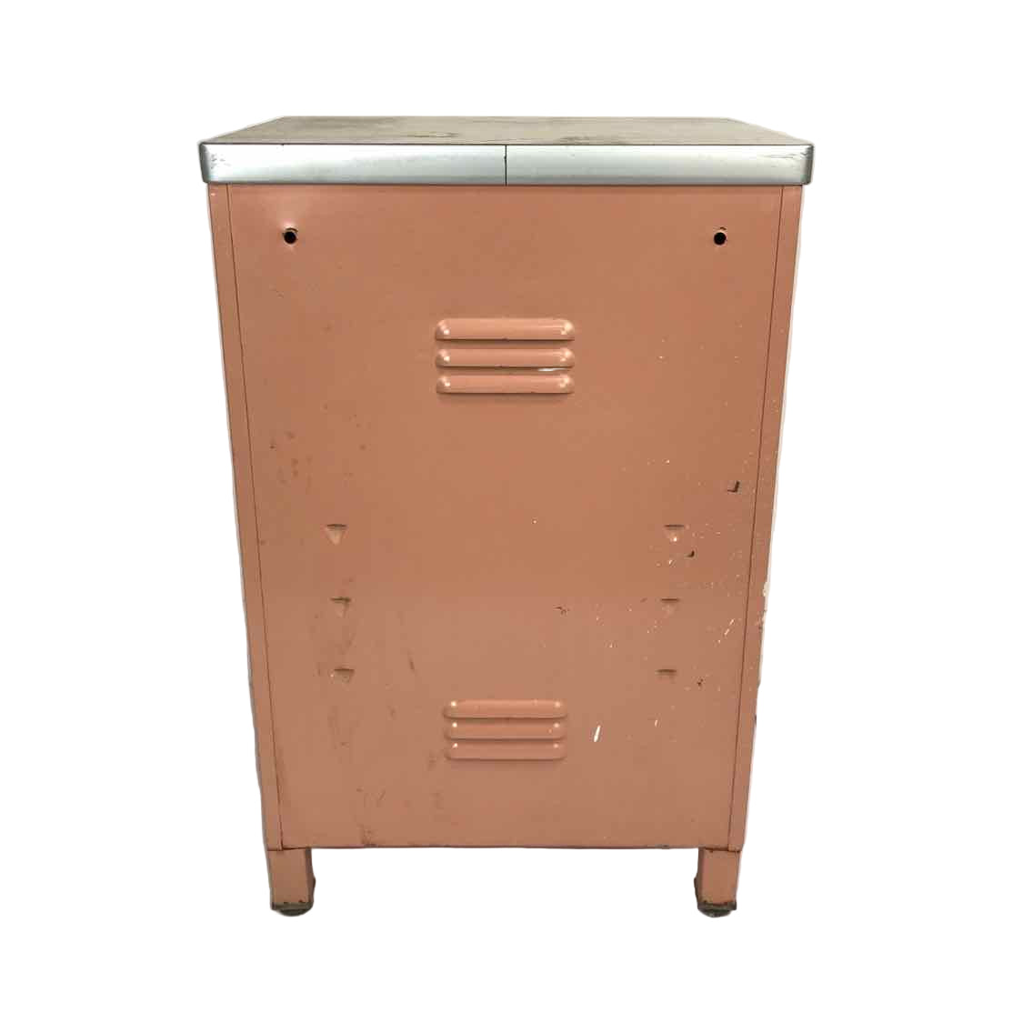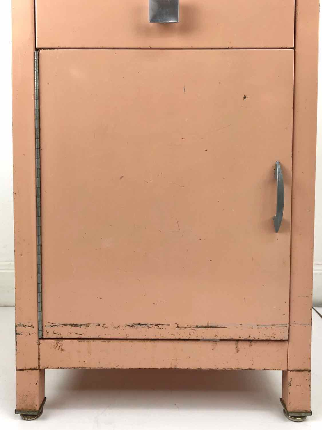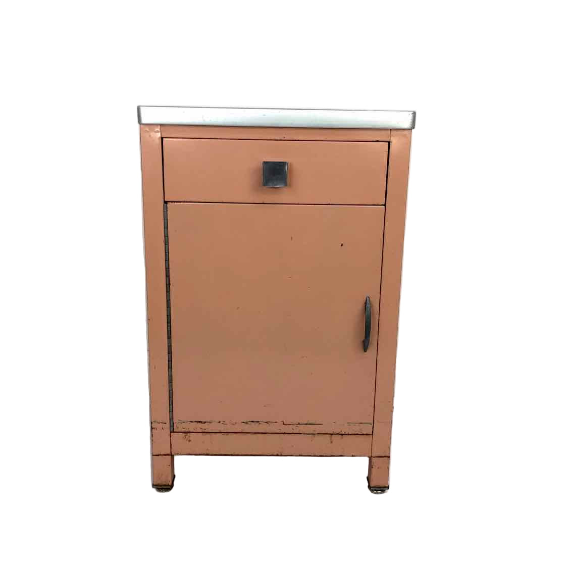 1940s metal nightstand in soft pink with a very nice faux wood formica top, in very good vintage condition with some surface wear and small rusty areas. The drawer and door work well.