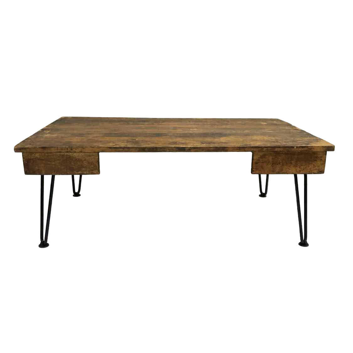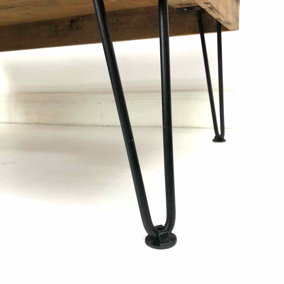This coffee table was originally a desk and one side has a space for a drawer, though it is not included. The original wooden legs have been replace with mid-century modern black hairpin legs. The rustic finish has been clear coated and the feet have floo