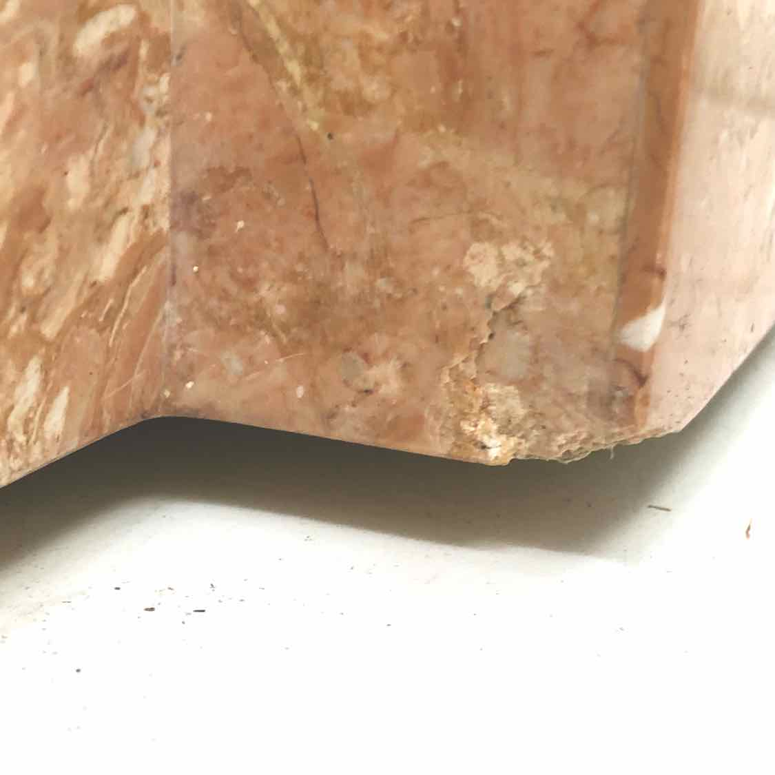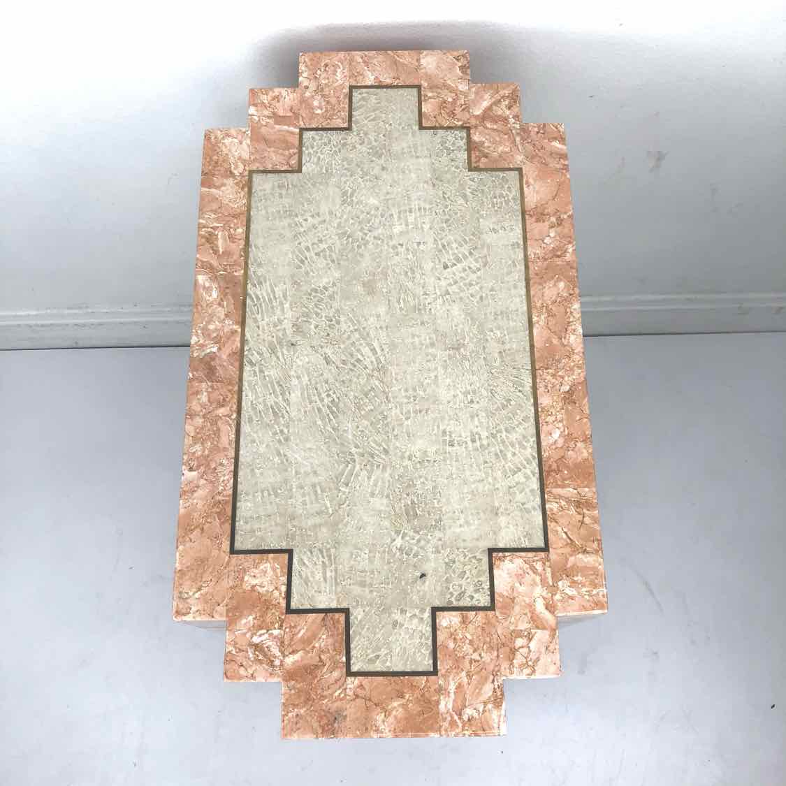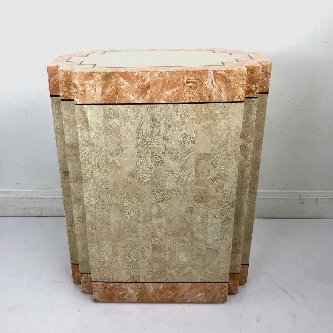 Vintage 1980s tessellated marble veneer pedestal with pink and cream and brass inlaid details, in very good vintage condition with a small chip on the base as shown.