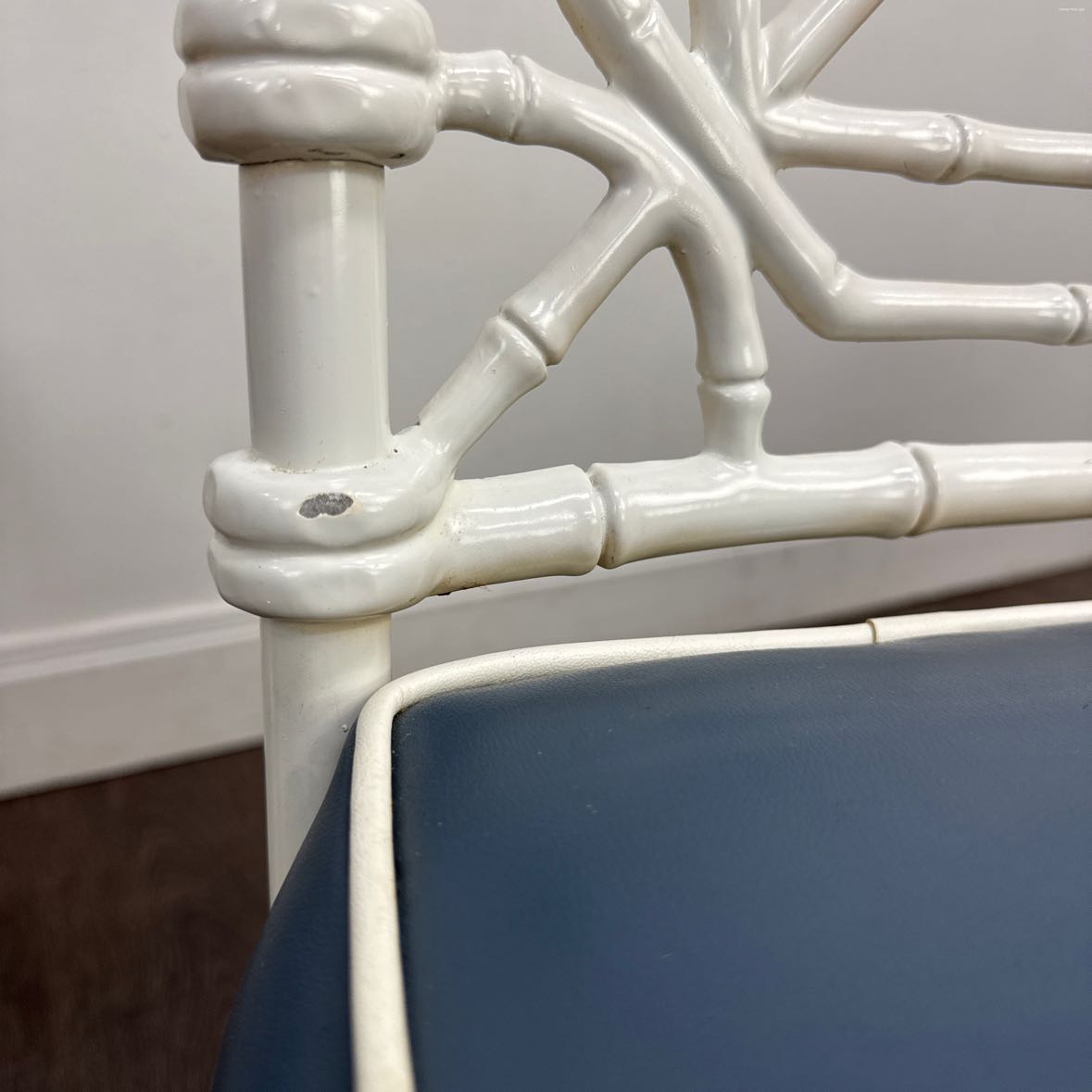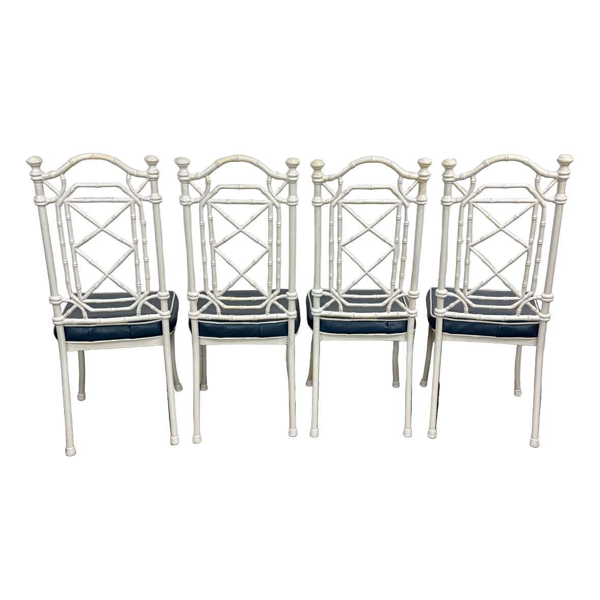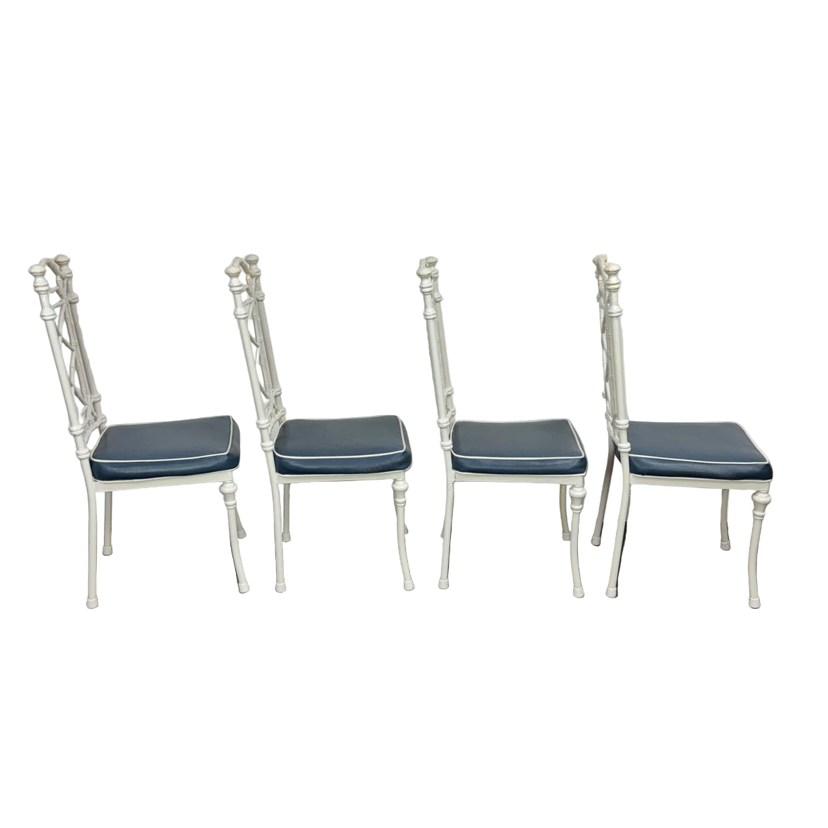 SET/4 Hollywood Regency dining chairs that look like bamboo but are actually cast aluminum. These have a vintage white paint job with some off-white undertones showing through and some overall wear, but they are sturdy. Original blue vinyl cushions with w