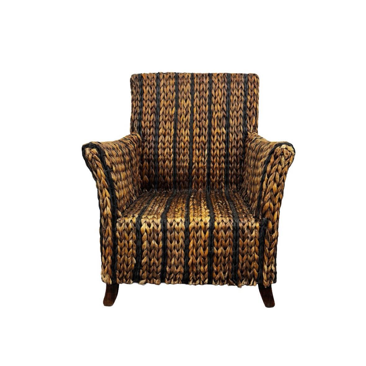 Sturdy woven seagrass chair with two tone stripes and wooden legs. It originally had a cushion to lift the seat up, but it works just as well without. In good vintage condition with some light surface wear to the material.