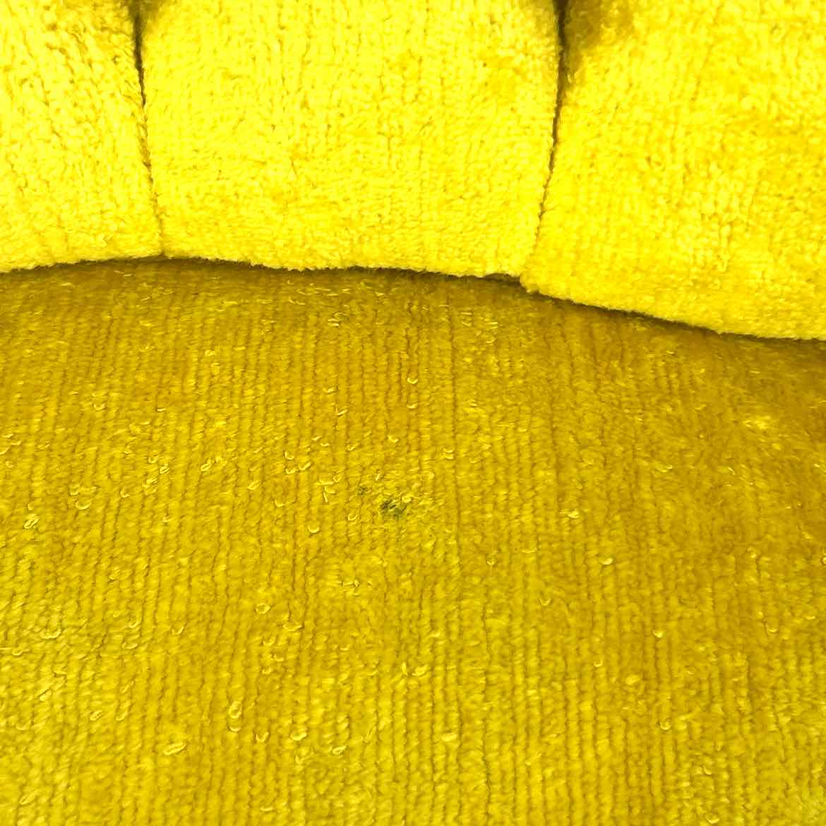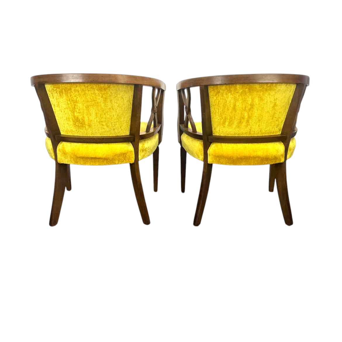 PAIR wooden barrel armchairs with bold yellow upholstery. They are in excellent vintage condition and sturdy.