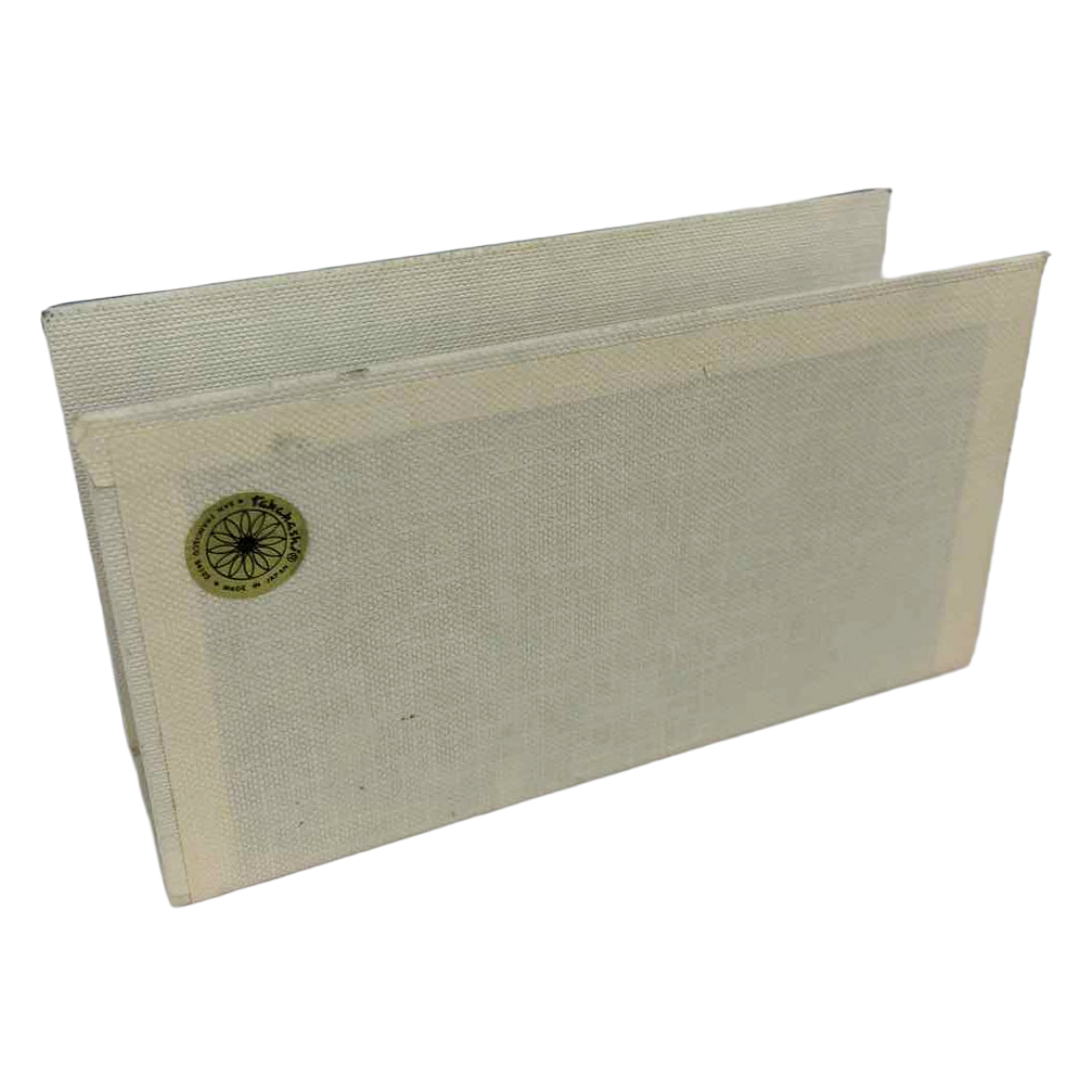 Vintage blue & white porcelain mail holder made in Japan by Takahashi. Only one side has a porcelain panel, and the body is metal wrapped in white sealed linen.