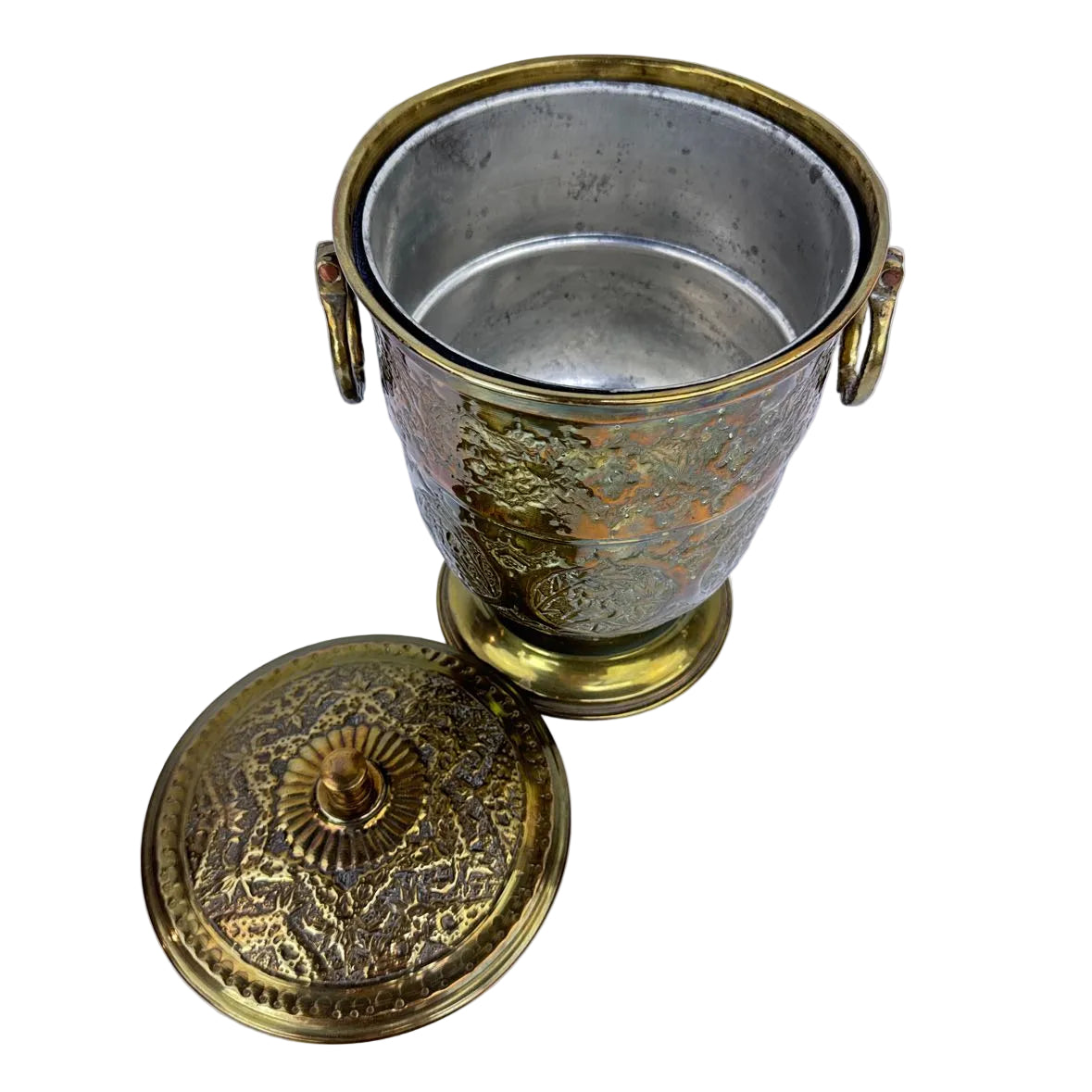 Nicely detailed brass ice bucket with a pedestal base. The silver toned metal insert is removable for cleaning. There is more patina on the inside than outside. | The sale of this item benefits Meals on Wheels in Midland, Tx.