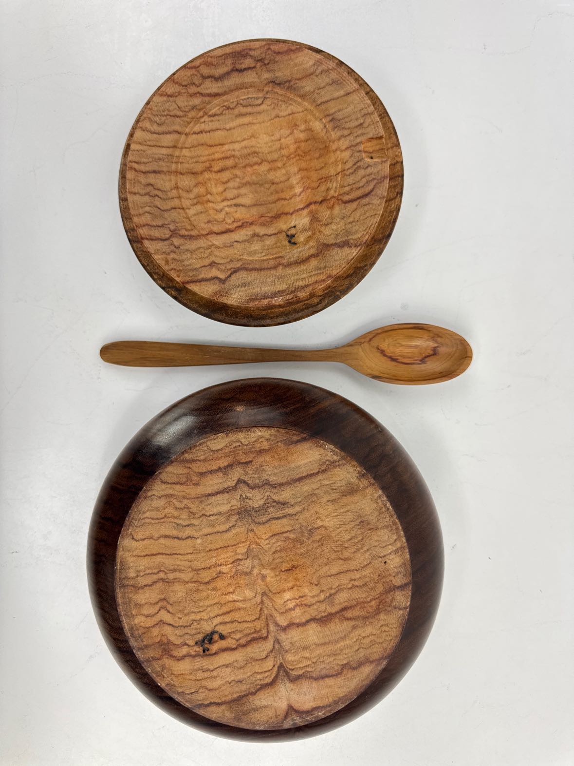 Carved wooden tureen with a spoon, made from a dense and nicely figured wood that looks like bocote (the spoon looks like another species). In very good vitnage condition with some light scuffs and fading.