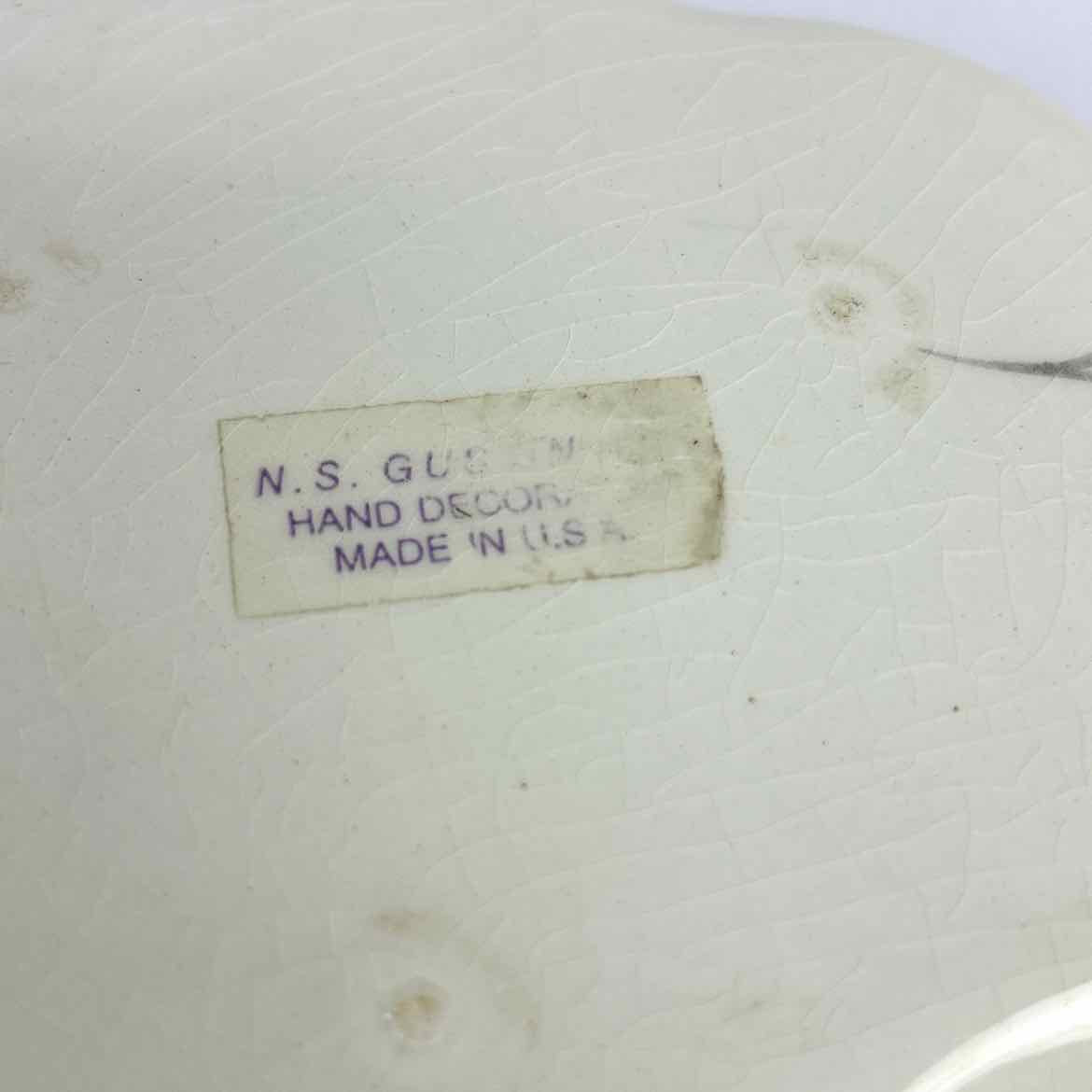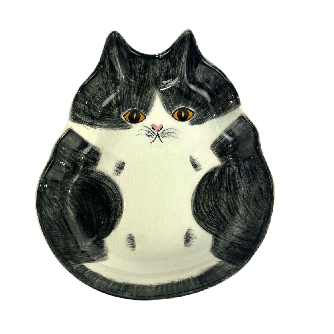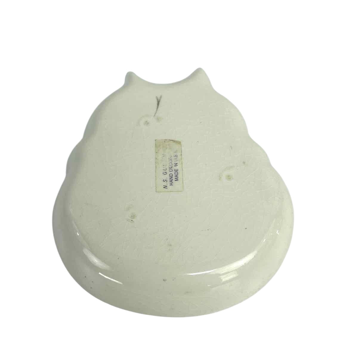 Hand painted 1960s ceramic bowl made in the USA by N.S. Gustin Co., in the shape of a serious faced black and white cat with orange eye, perfect for Halloween serving or daily display. In very good vintage condition with heavy crazing as shown.