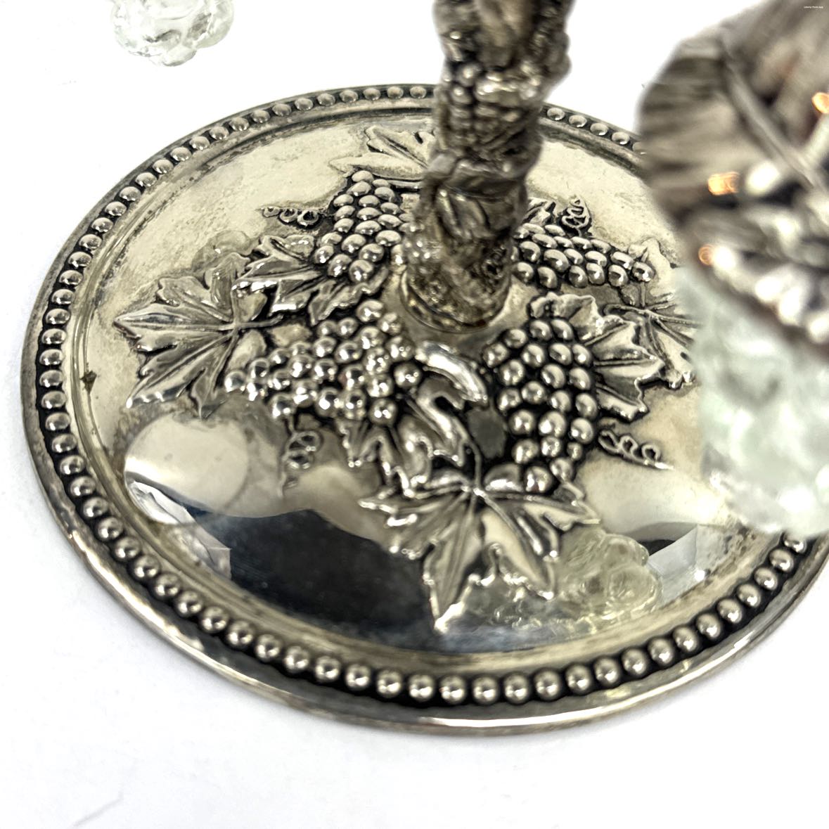 Adorable silver tone salt and pepper shaker set with stand by Godinger, with shakers shaped like clear glass grapes with the look of silverplate on the metal. In excellent vintage condition.