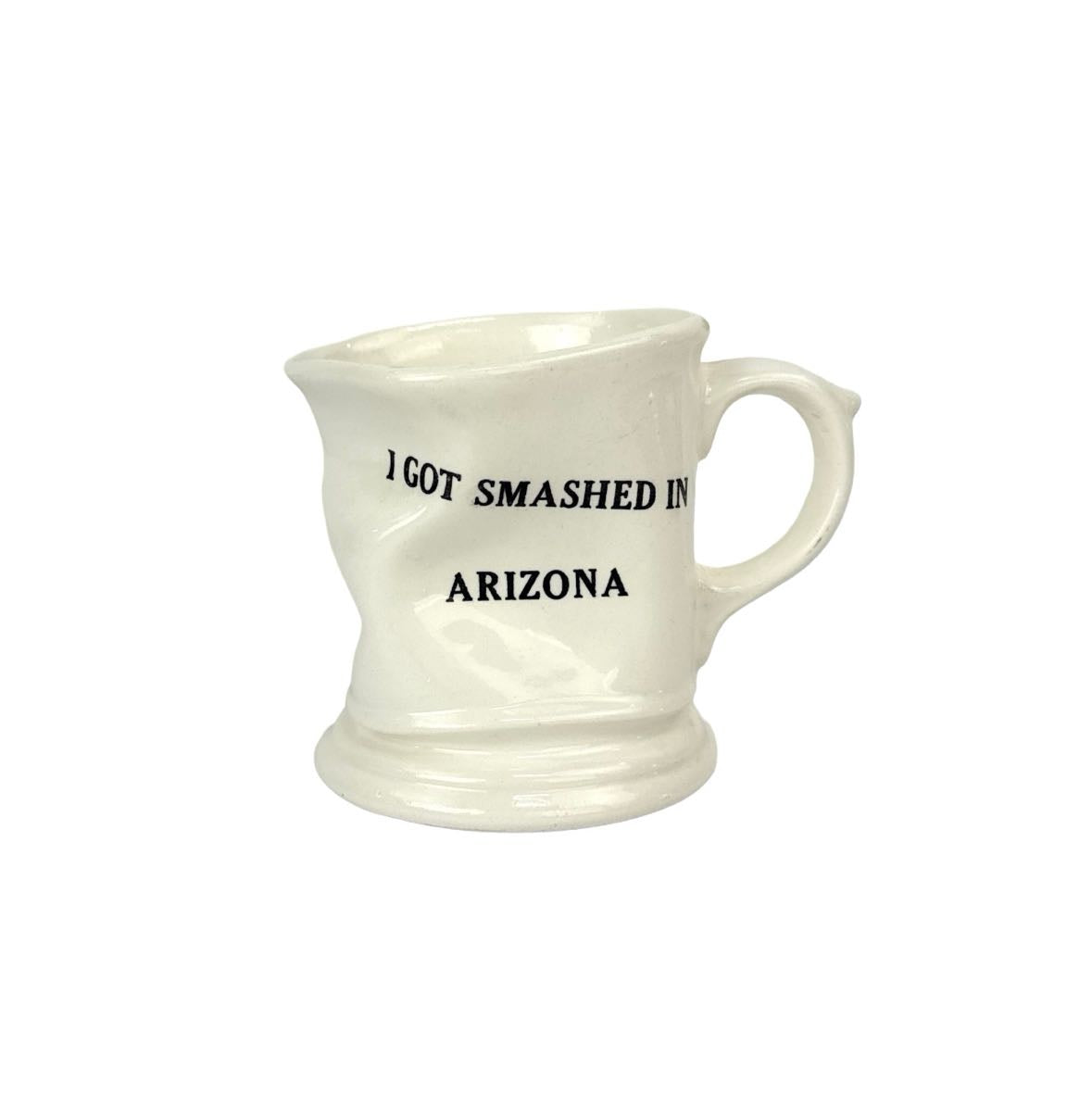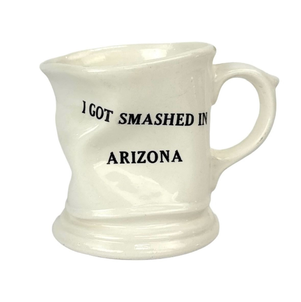 Crumpled vintage ceramic mug that says "I GOT SMASHED IN ARIZONA" in black letters on a plain white mug, made in Japan c. 1970s. In very good vintage condition with some crazing but no chips or cracks.