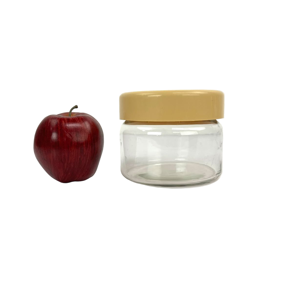 Space Age modern clear glass canister with a tan plastic lid, in very good vintage condition with a few light scuffs to the plastic but no chips or cracks.