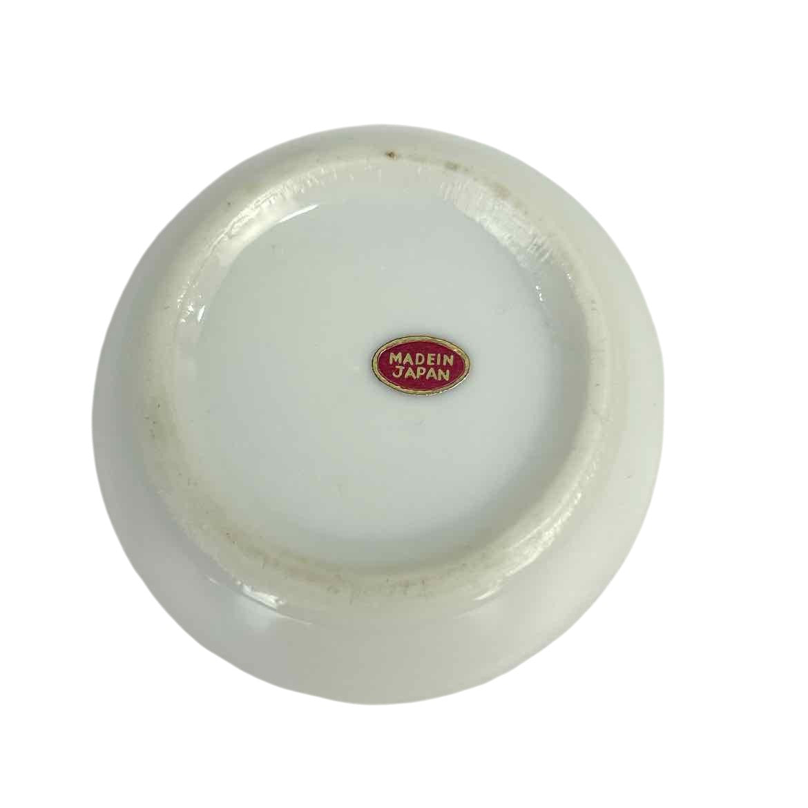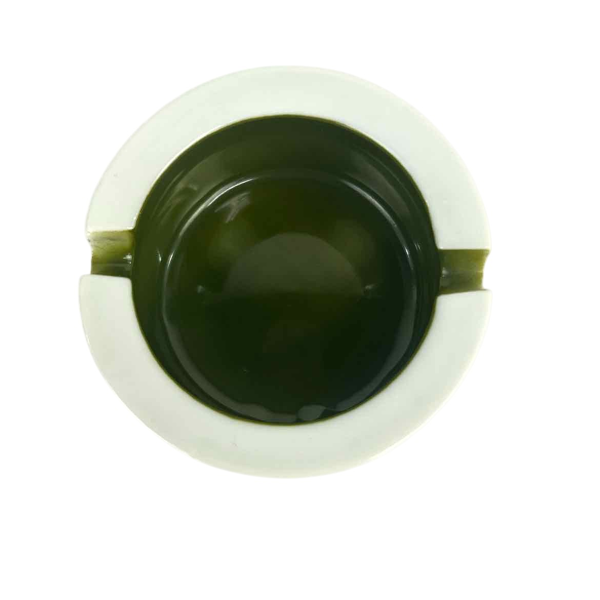 Adorable mid-century modern porcelain ashtray made in Japan with a glossy white exterior and a matte olive green interior. Has two skinny parking spots carved into it