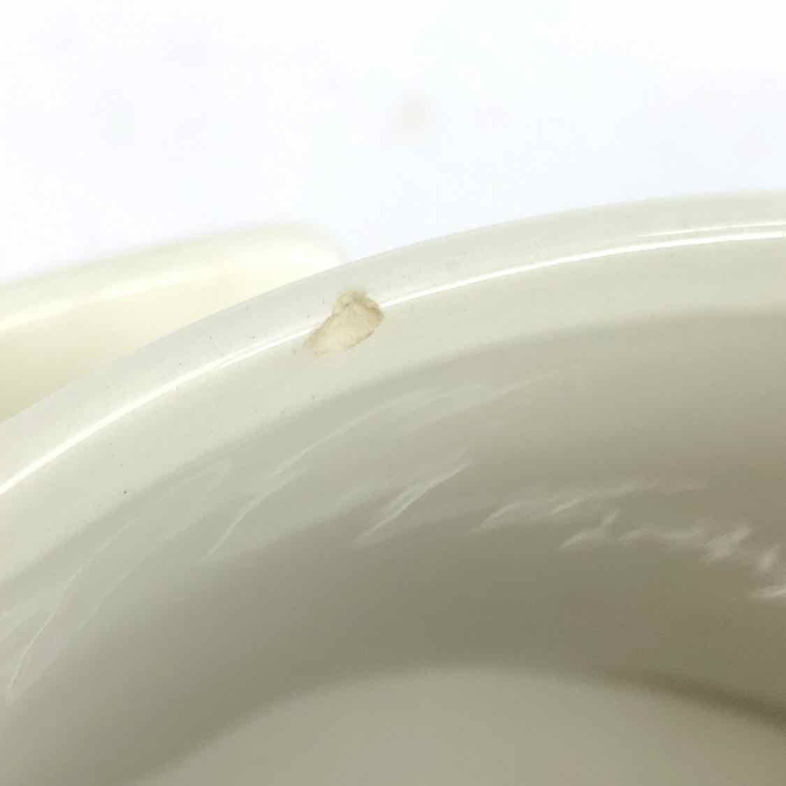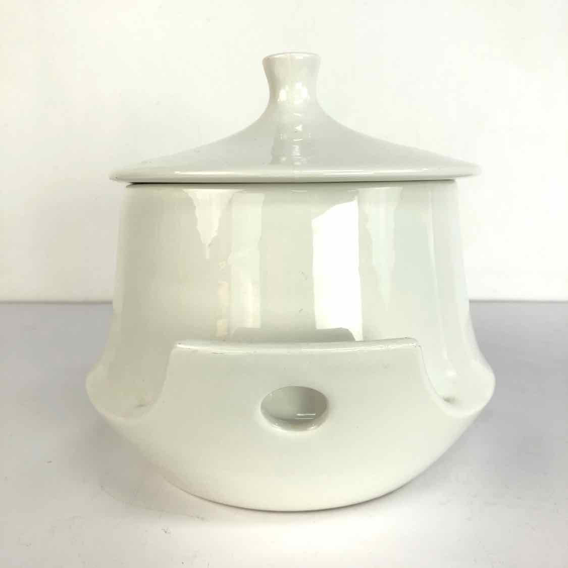 Mid-century modern soup tureen or queso pot with cute handles and a lid that has a hole cut out for a serving spoon. In very good vintage condition with a small rim chip inside that is covered by the lid.