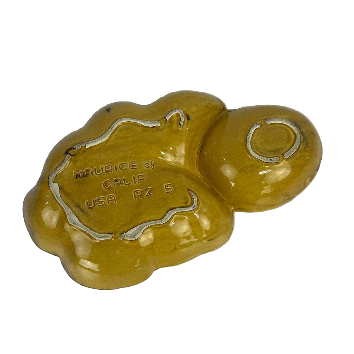 This mid-century pottery chip and dip bowl looks like either a pine cone with needles spread out, or a pineapple. In overall good vintage condition with a couple of small rim chips as shown. See photos. Stamped Maurice of California USA on the underside.