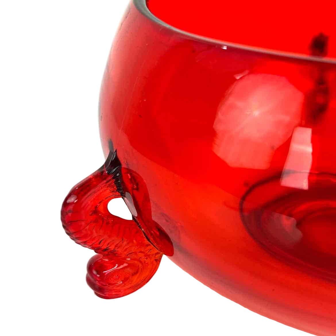 Bold red glass bowl with three fish handles on the sides, perfect for displaying items on a coffee table, or catching the light in a window. Excellent vintage condition with some small flaws from being handmade, but no chips or cracks.