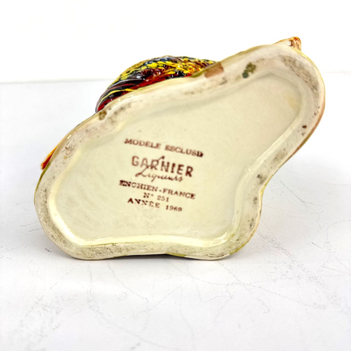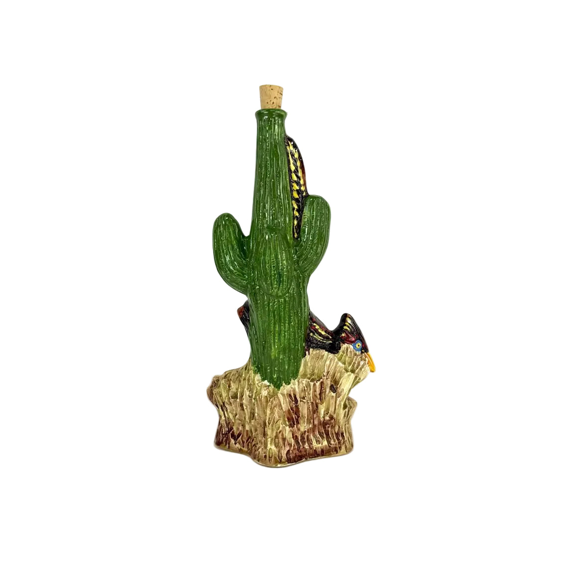 Sculptural roadrunner and saguaro cactus liquor bottle c. 1969, made in France by Garnier to hold Creme de Menthe. Labeled Road Runner New Mexico, in good vintage condition with light wear, original labels and no cork. Super cool for a home bar.