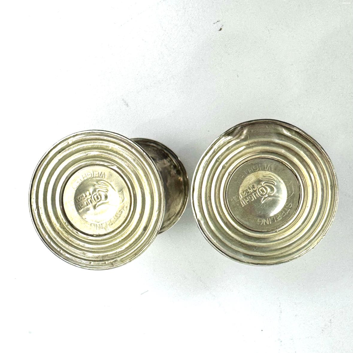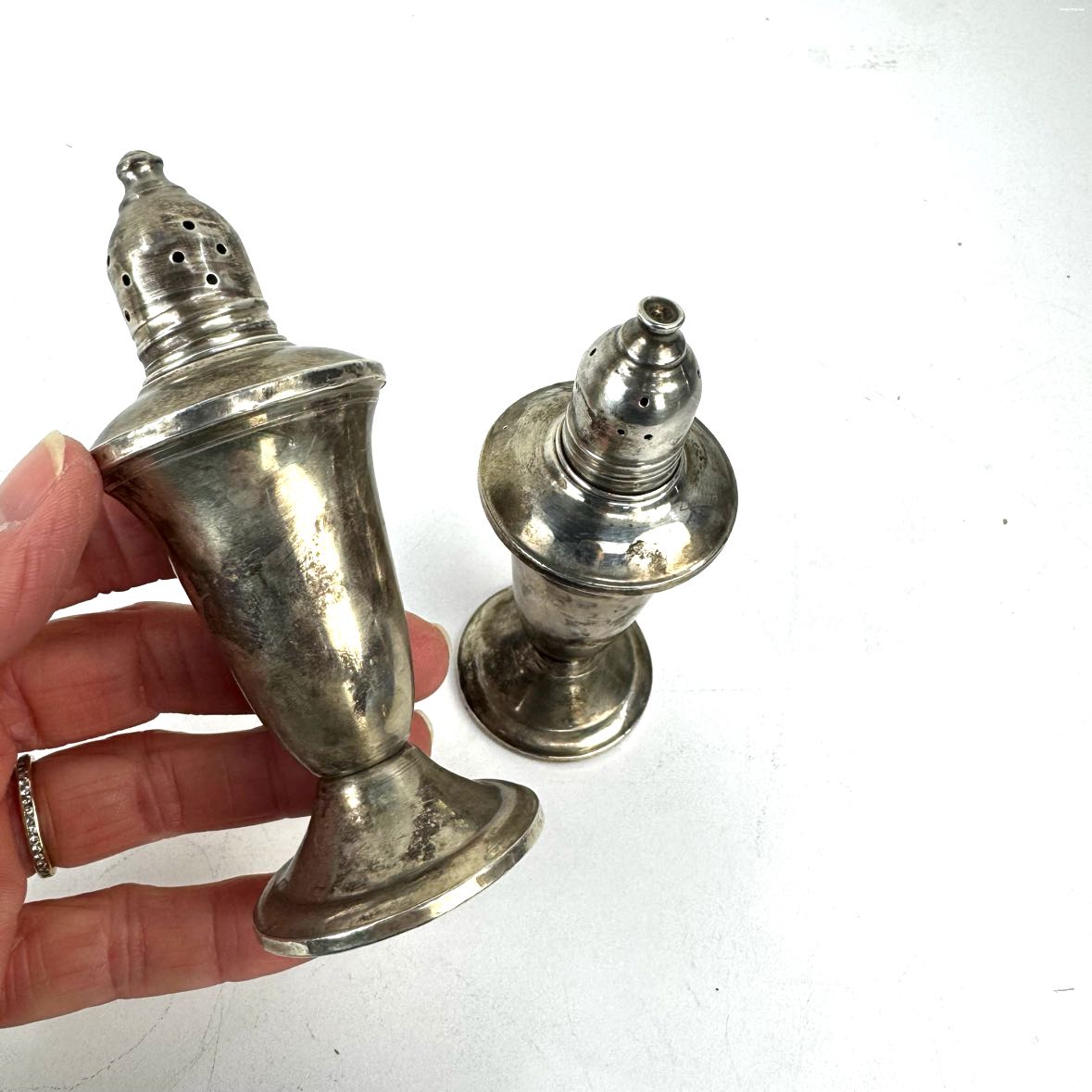 PAIR vintage sterling silver salt & pepper shakes made by Duchin Creations, in good vintage condition with a few dents and some patina as shown. Stamped weighted sterling on the underside.