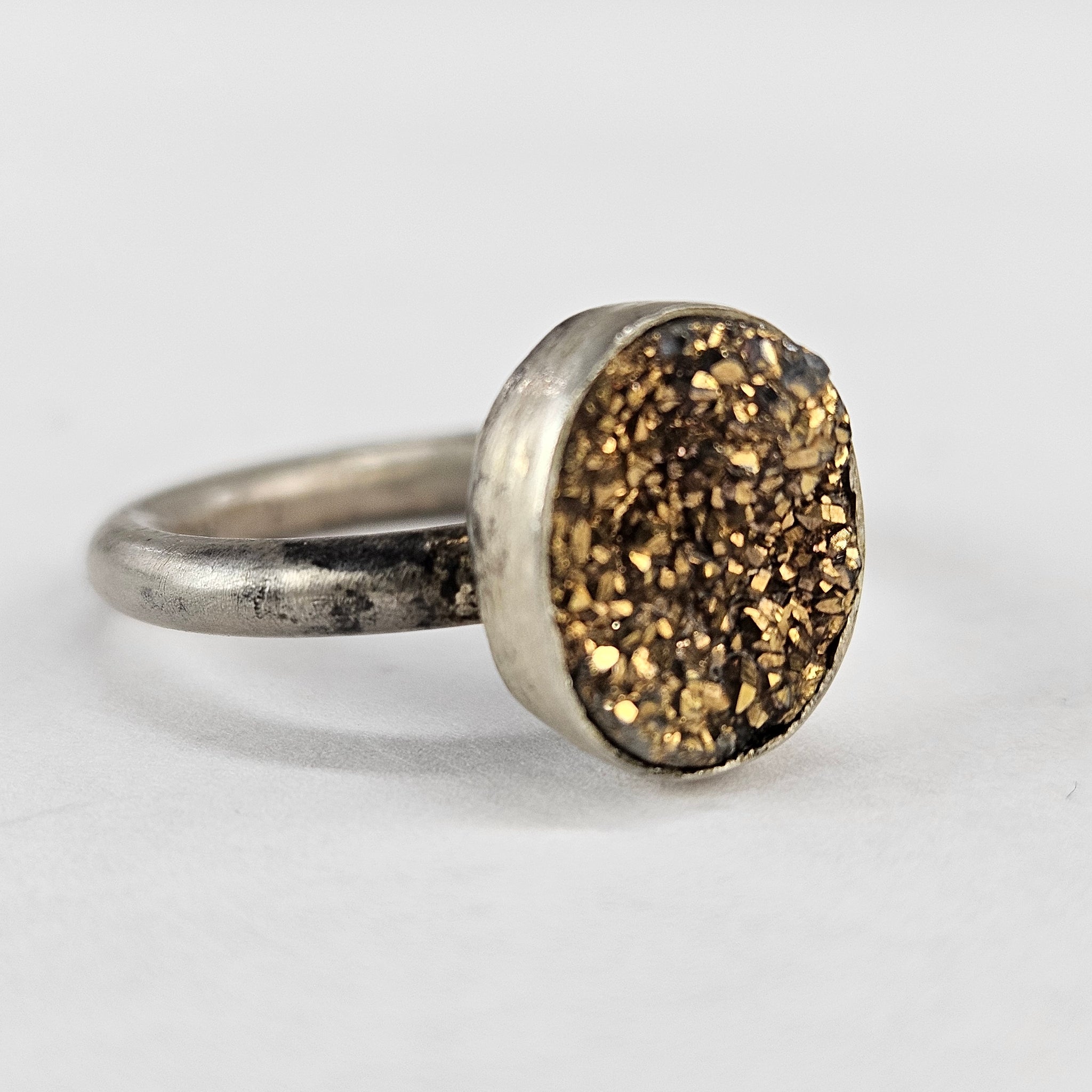 Chunky sterling silver ring with a gold druzy crystals cabochon floating on a round band, in very good vintage condition with some patina. Stamped Sterling on the underside.