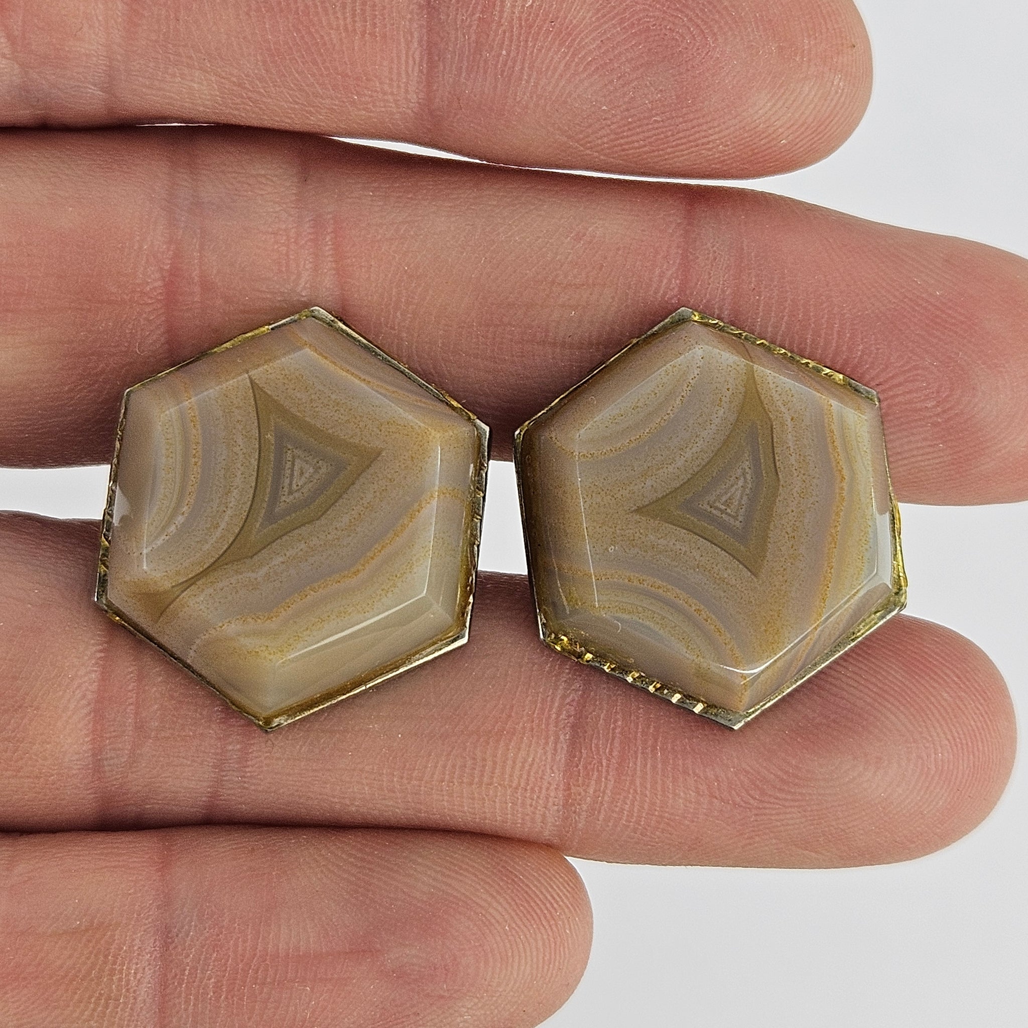PAIR handmade vintage cufflinks with striped purple-gray crazy lace agate and gold tone metal, in good vintage condition with some patina to the metal. Measures 1"x1"x.75".