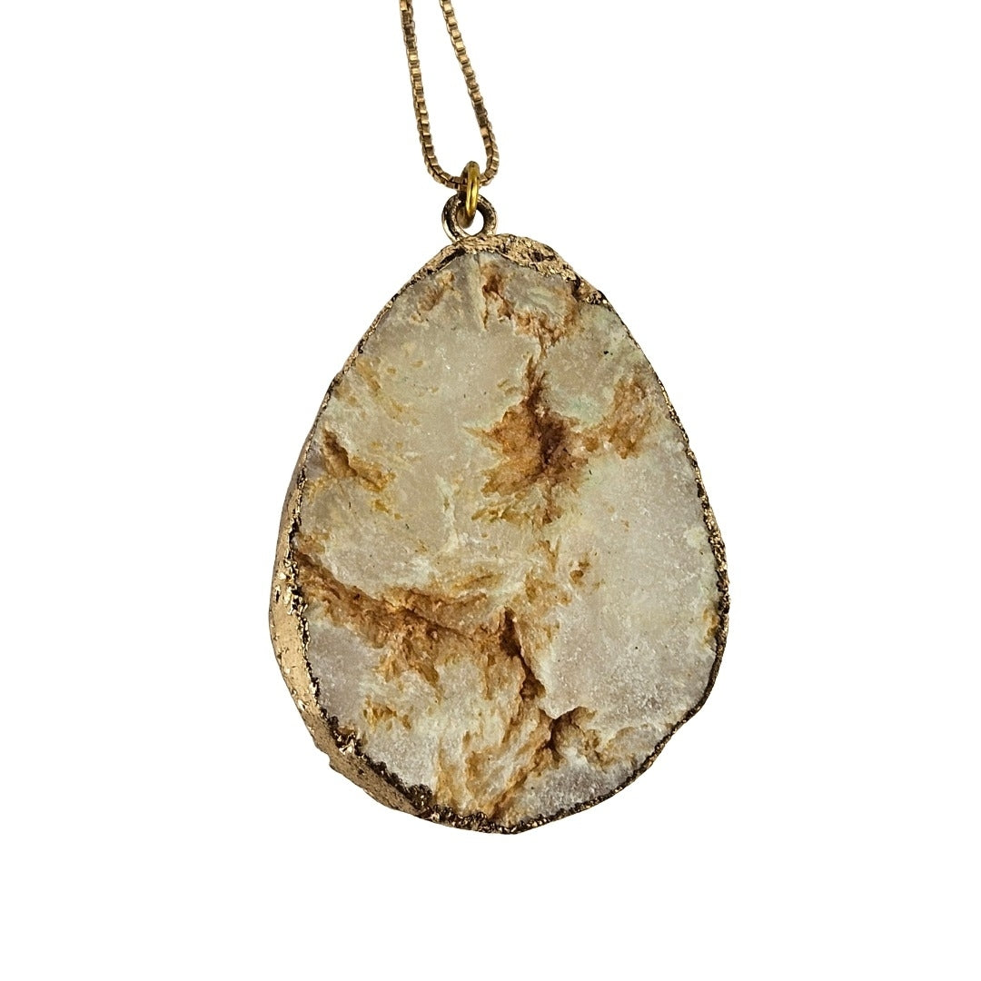 Gold dipped druzy crystal specimen necklace with white crystals, hanging on a gold tone .925 sterling silver chain made in Italy. The chain measures 19" long, and it is in excellent vintage condition.