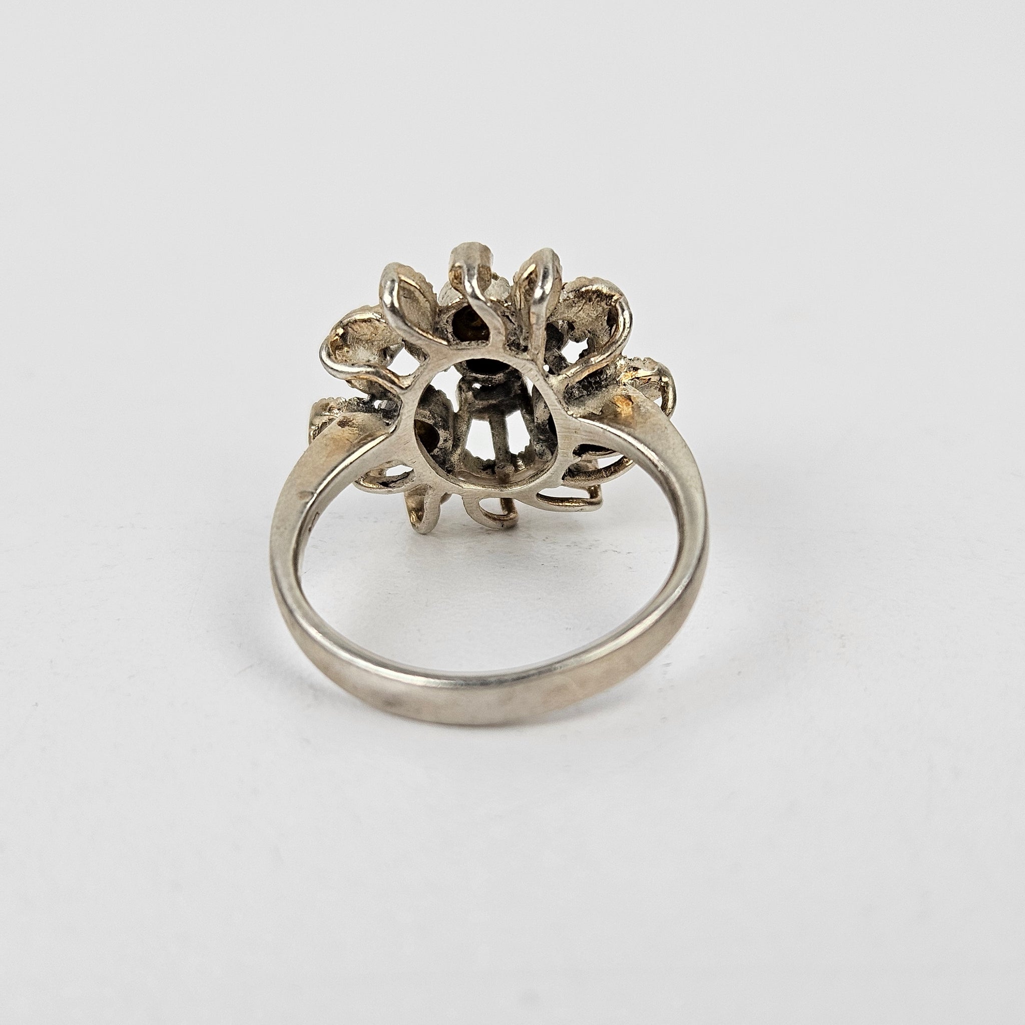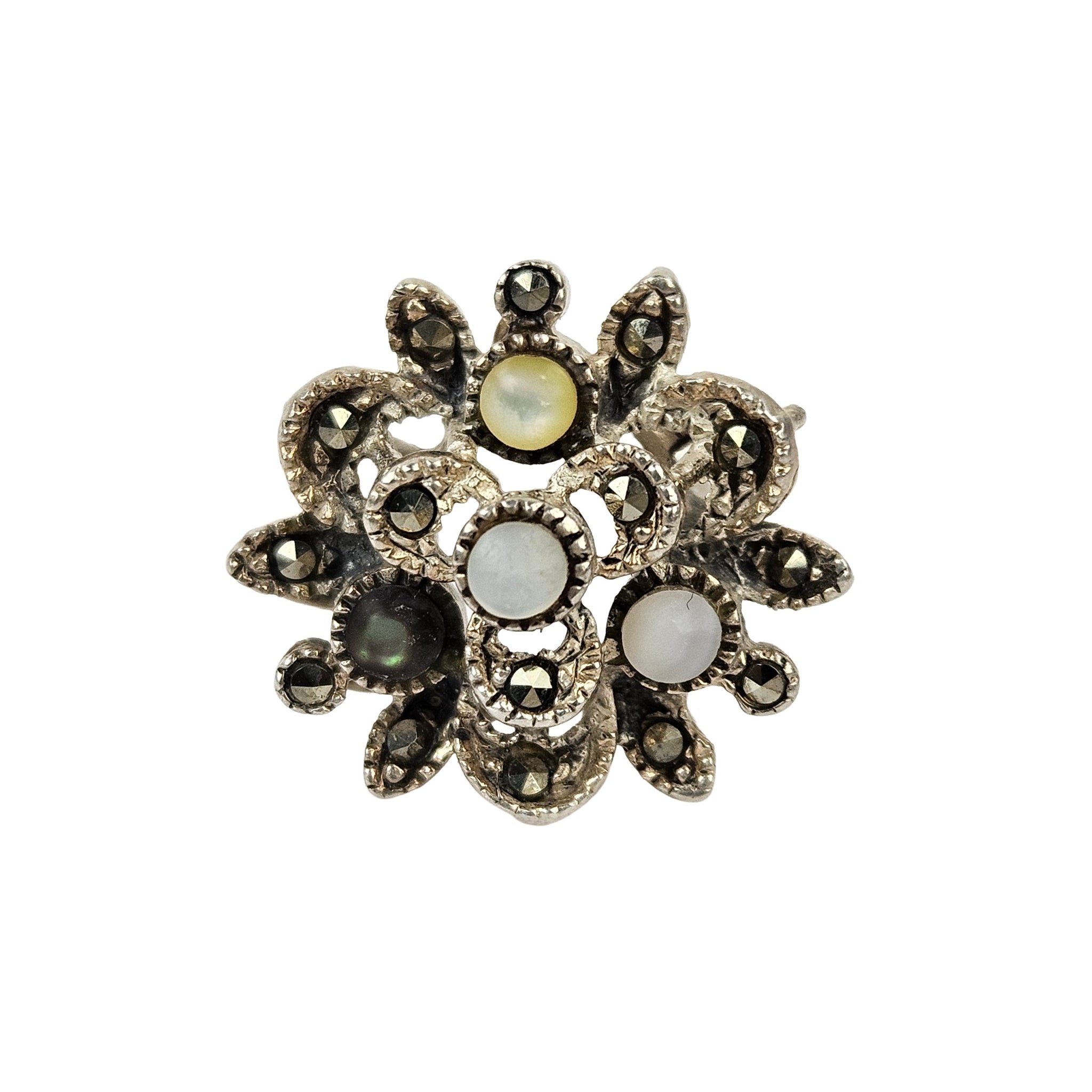 Vintage sterling silver multi stone ring with marcasite, moonstone, quartz, and labradorite, in good vintage condition and lightly polished.