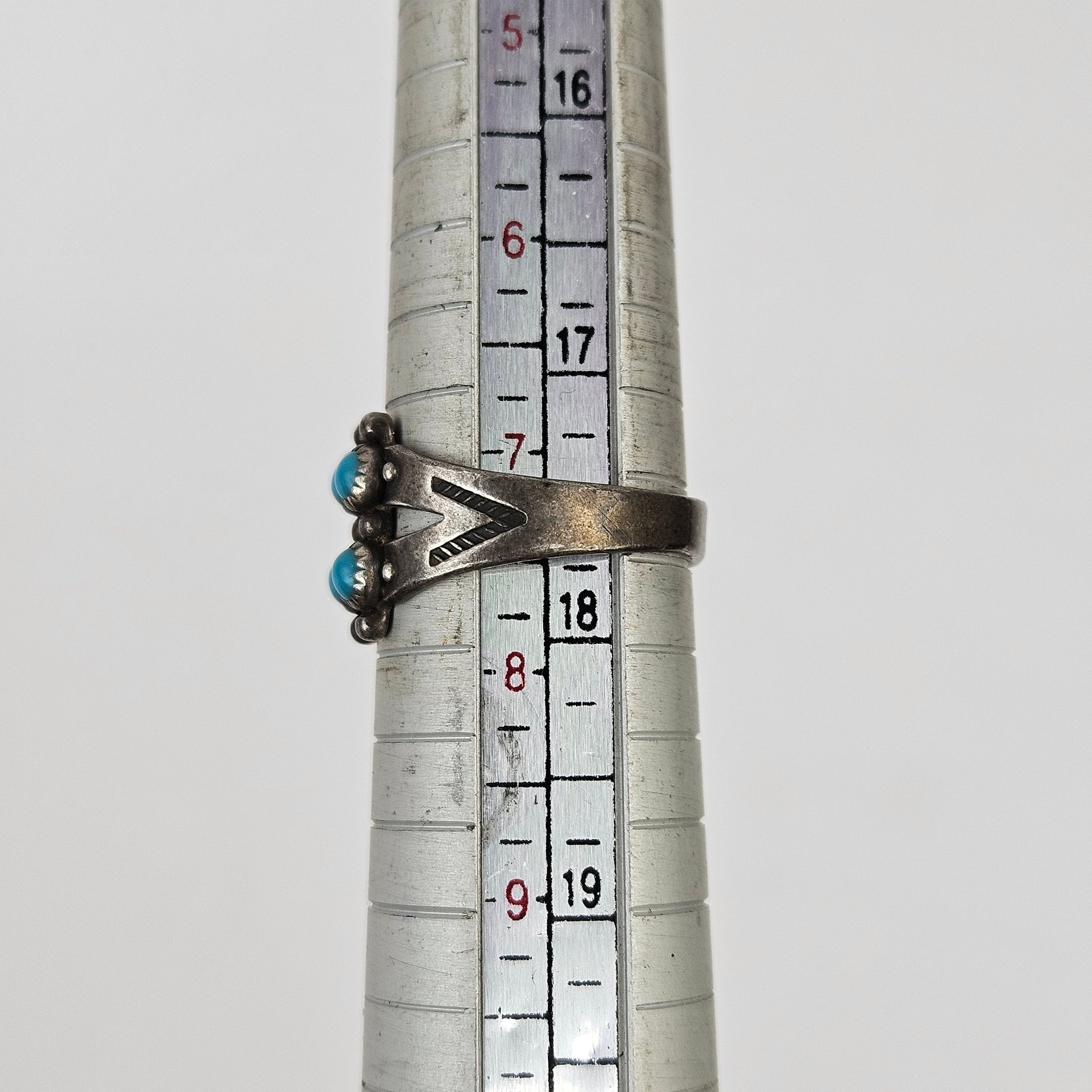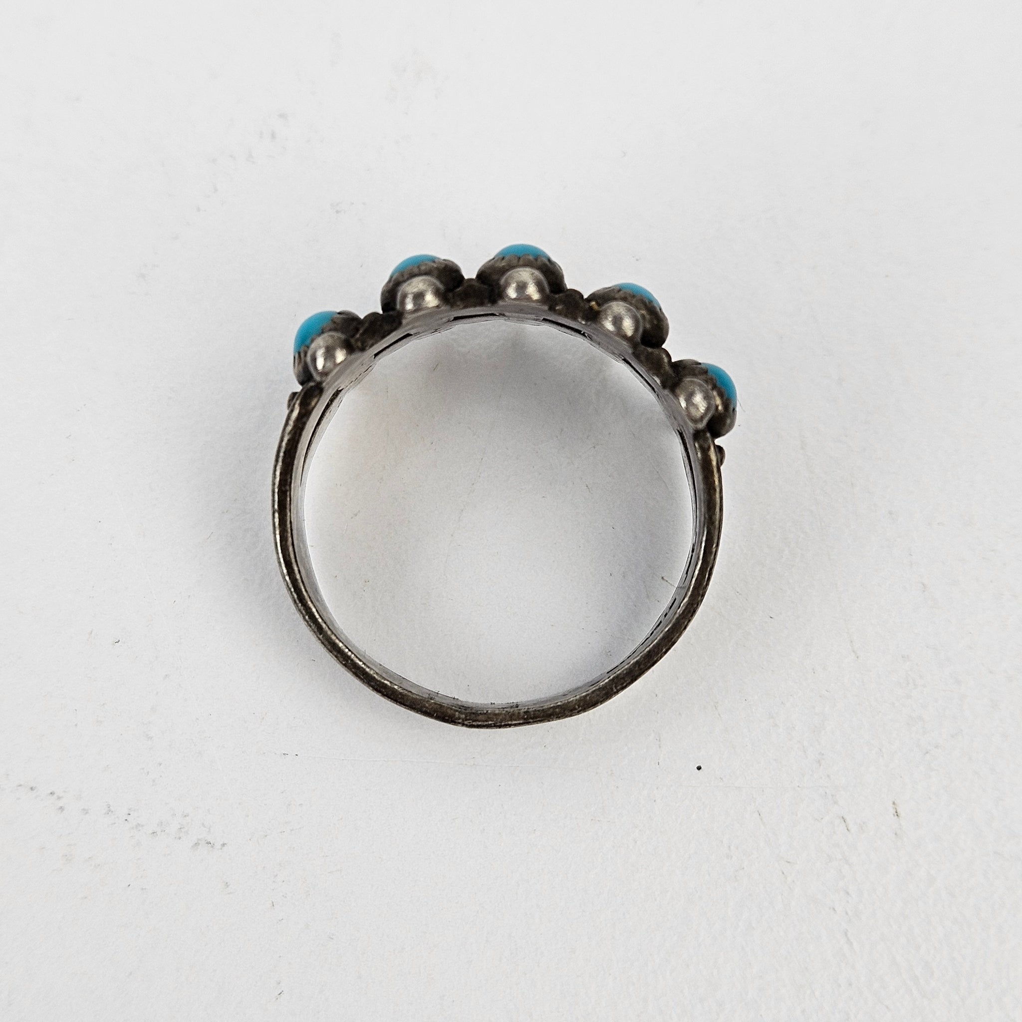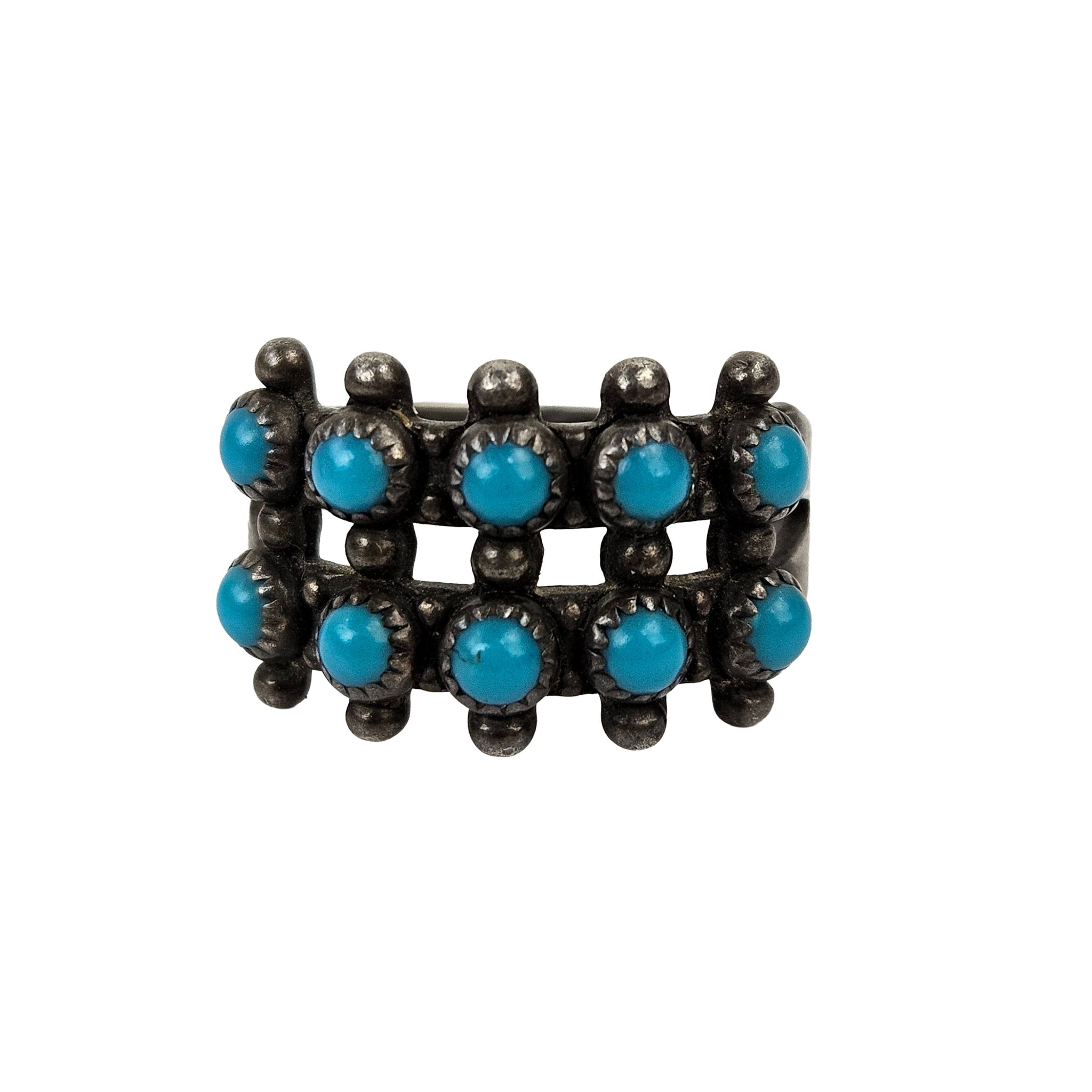 Southwest Navajo style sterling silver ring with a grid of 10 small round turquoise cabochons, in excellent vintage condition with original patina. Can be polished to a high shine. Stamped Sterling.