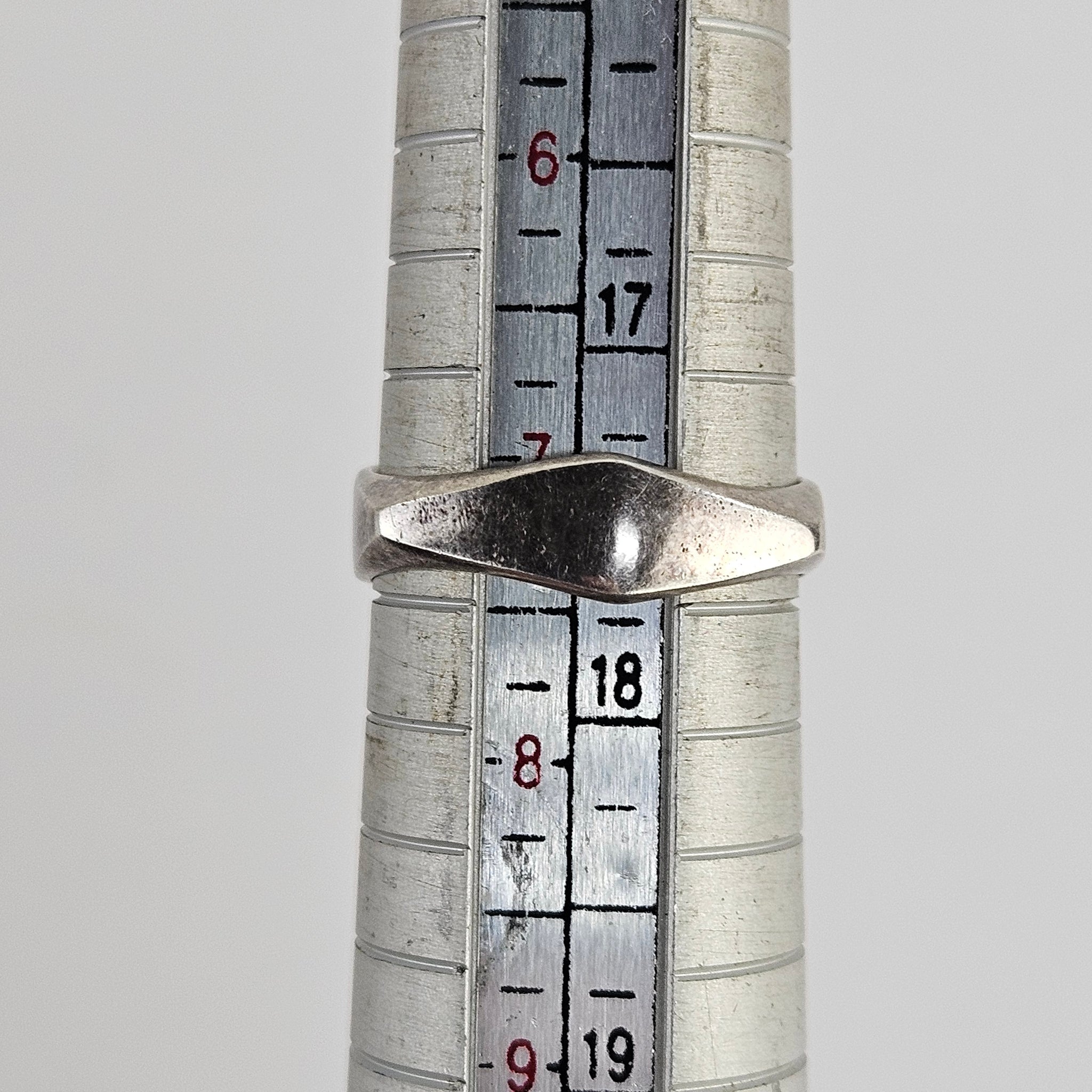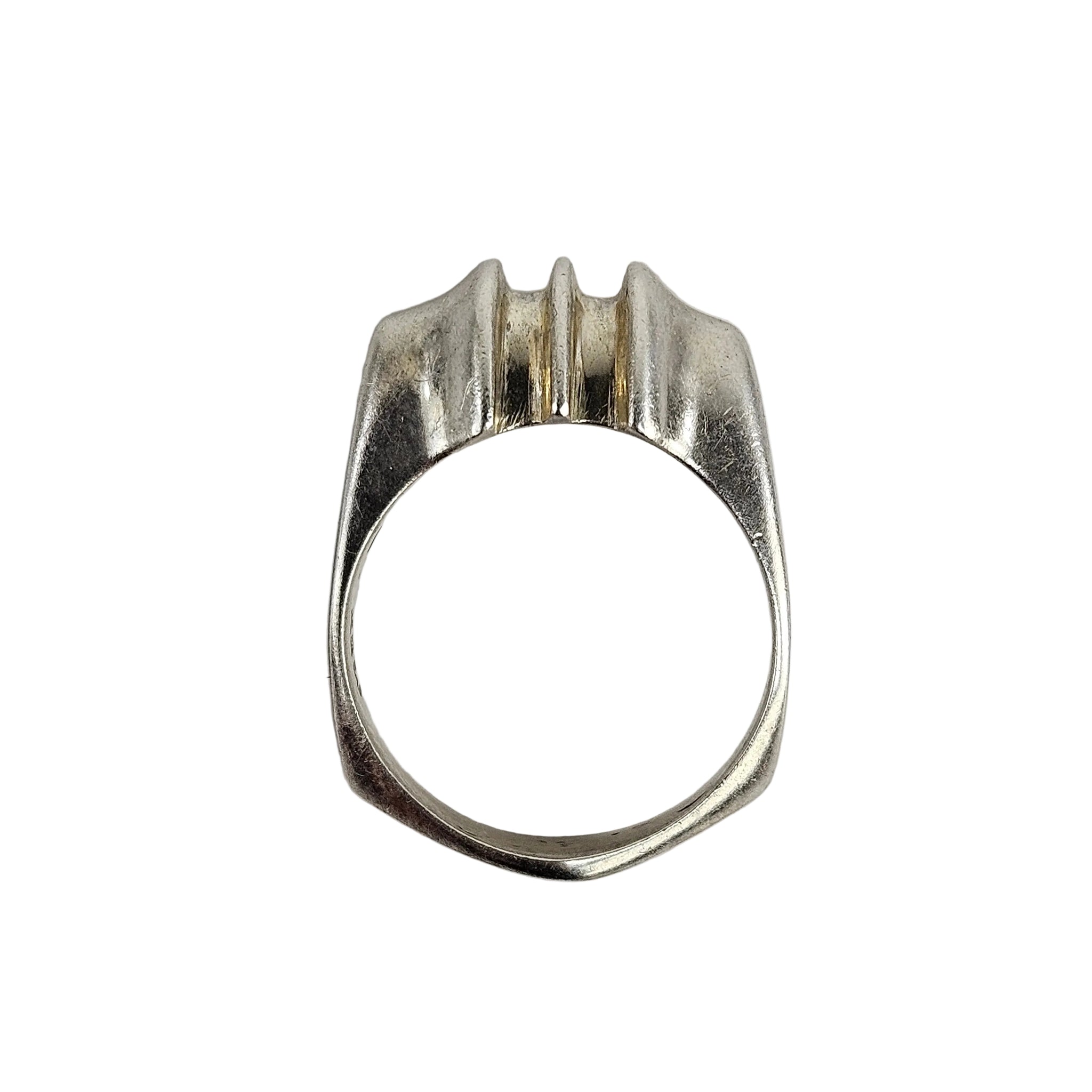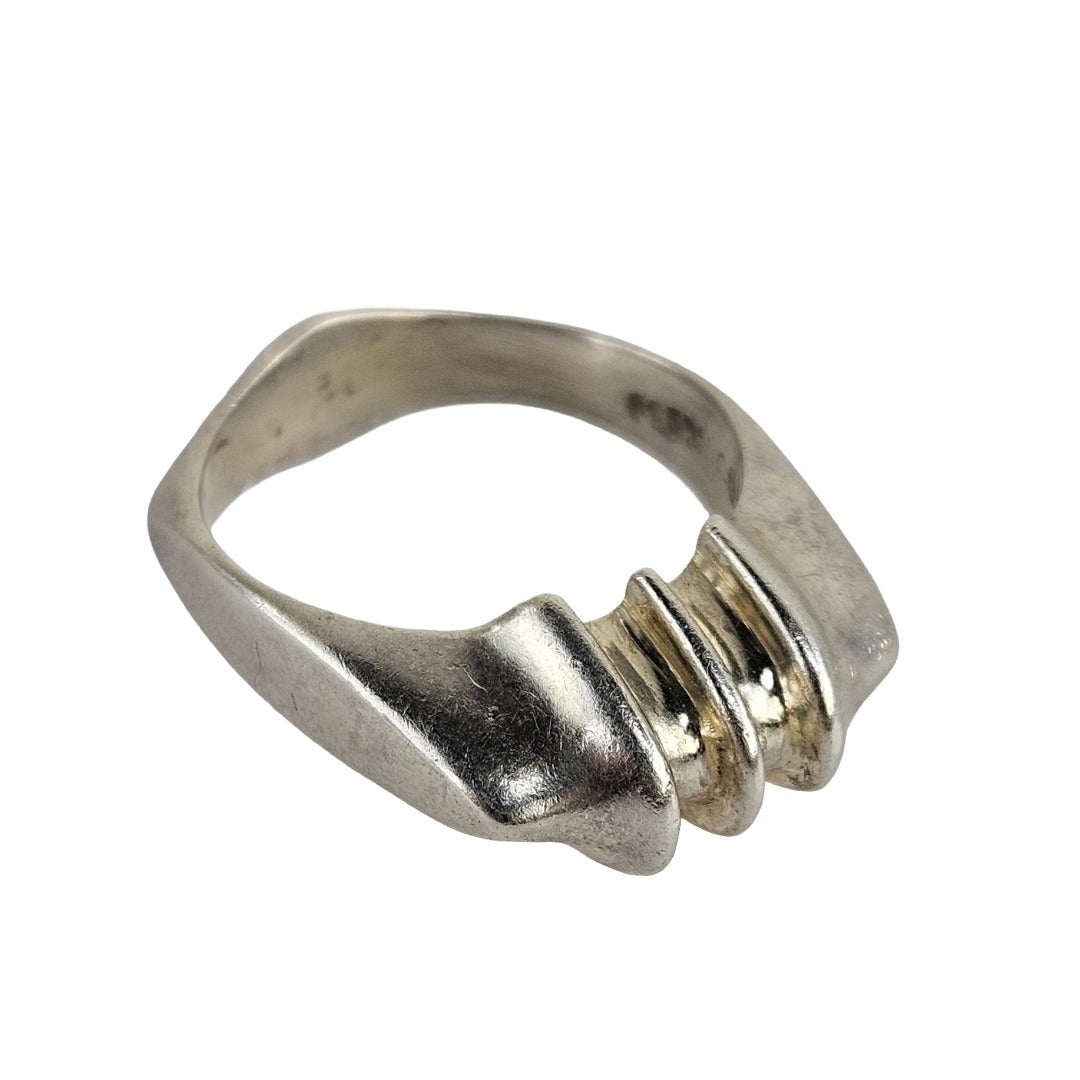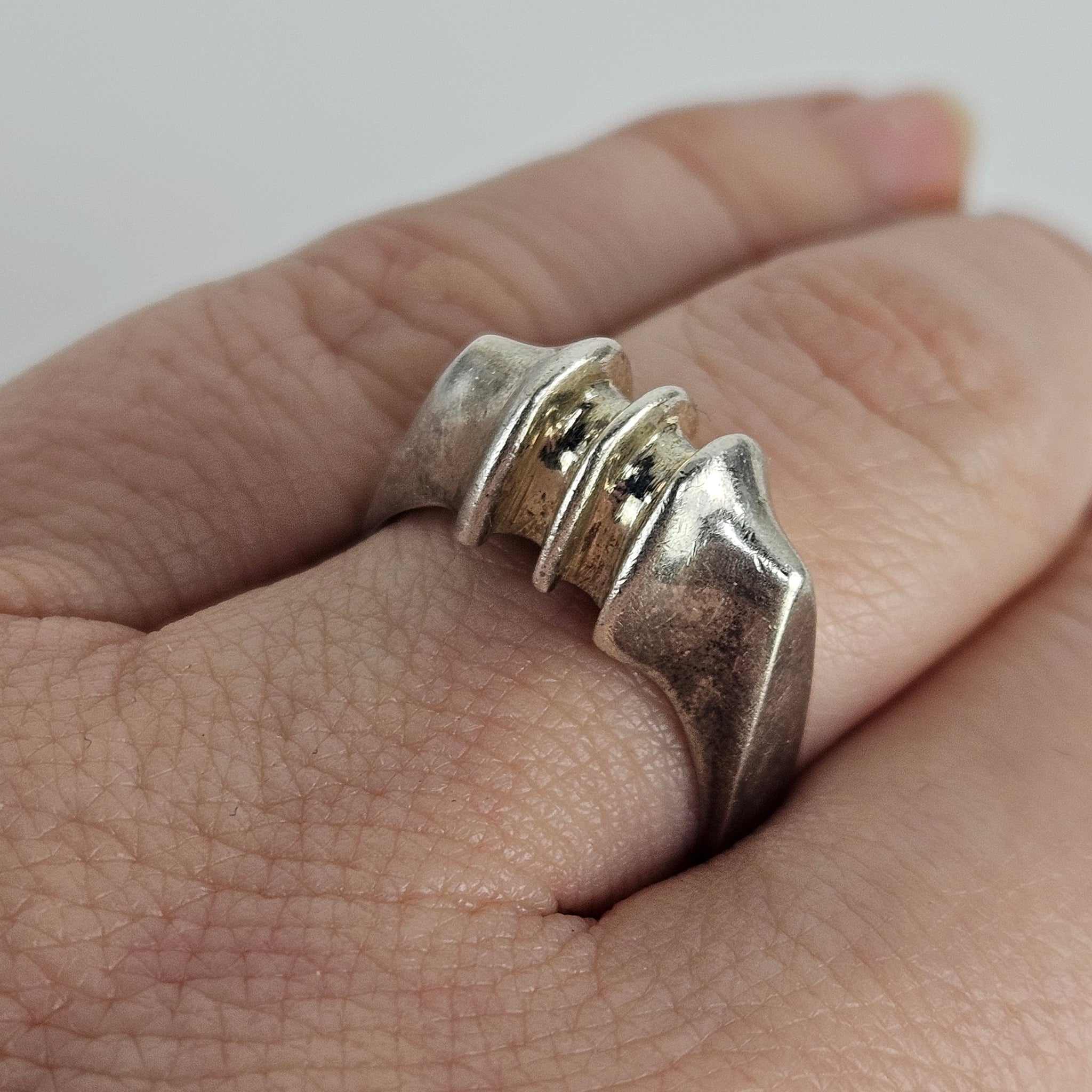 Heavy sterling silver ring with nicely sculpted arch designs and angular band, in excellent vintage condition and stamped MEXICO. Weighs 8.10g.